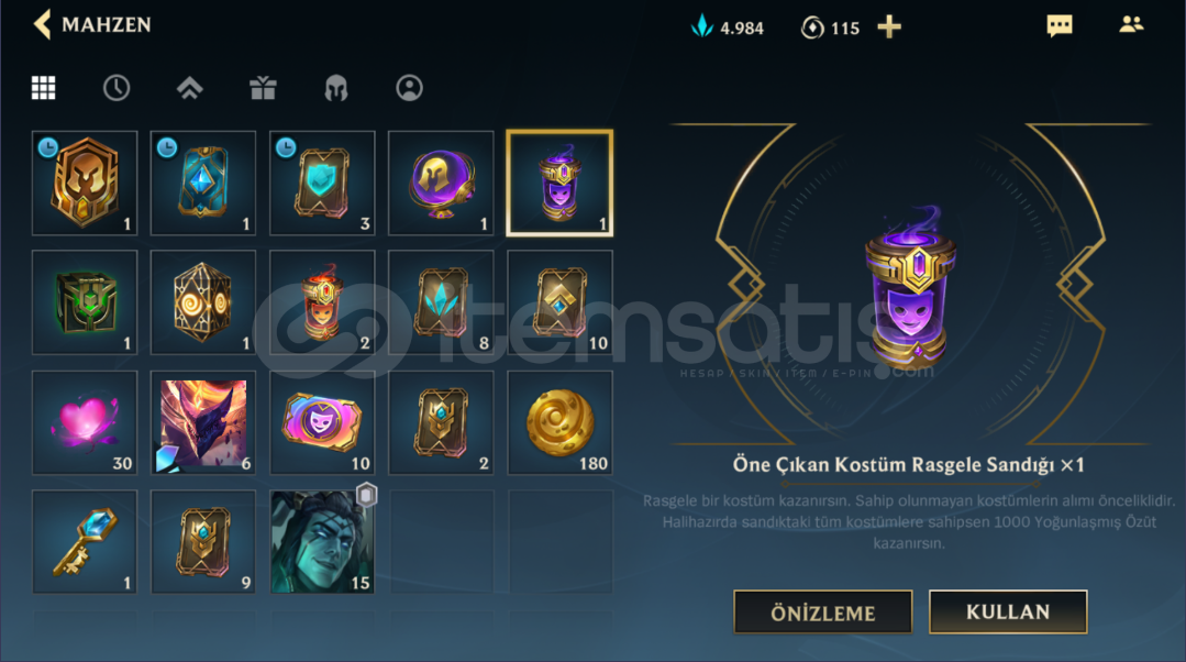 57 LevelMaster Düşmesi Altın4984 Mavi öz 115vç69 Simge 12 Çerçeve1x Rasgele Kostüm Sandığı2x Ay Festivali Rasgele Kostüm Sandığı1x Poro Mağzası Rasgele Kostüm Sandığı9 Profil Çerçevesi59 Şampiyon 40 Kostüm1745 Yoğunlaşmış ÖzütEposta Şifre Değiştirebilirsiniz
