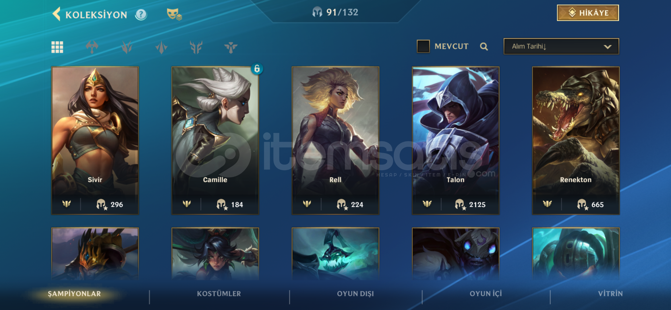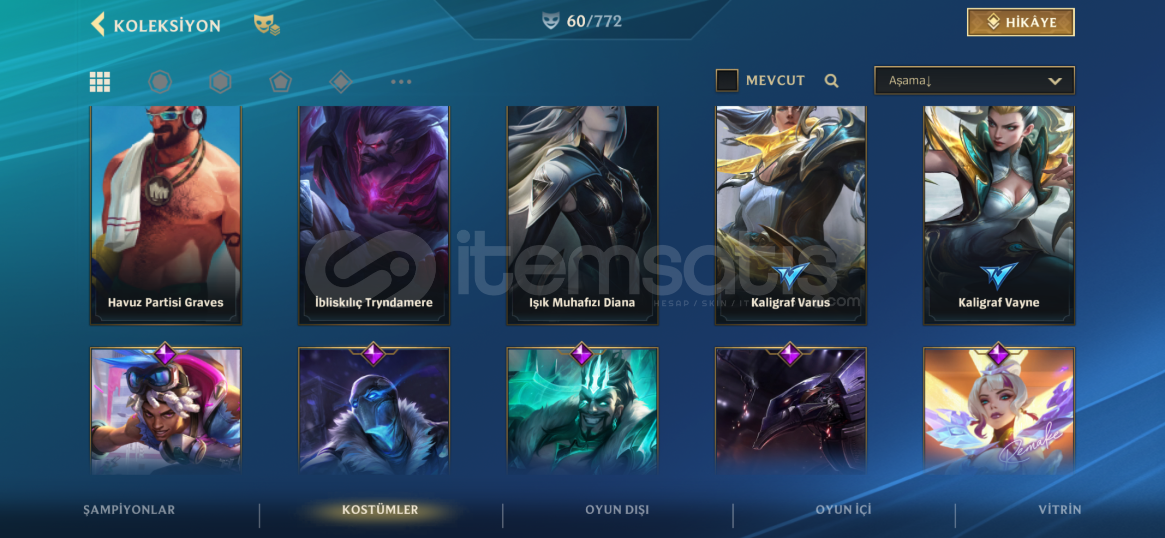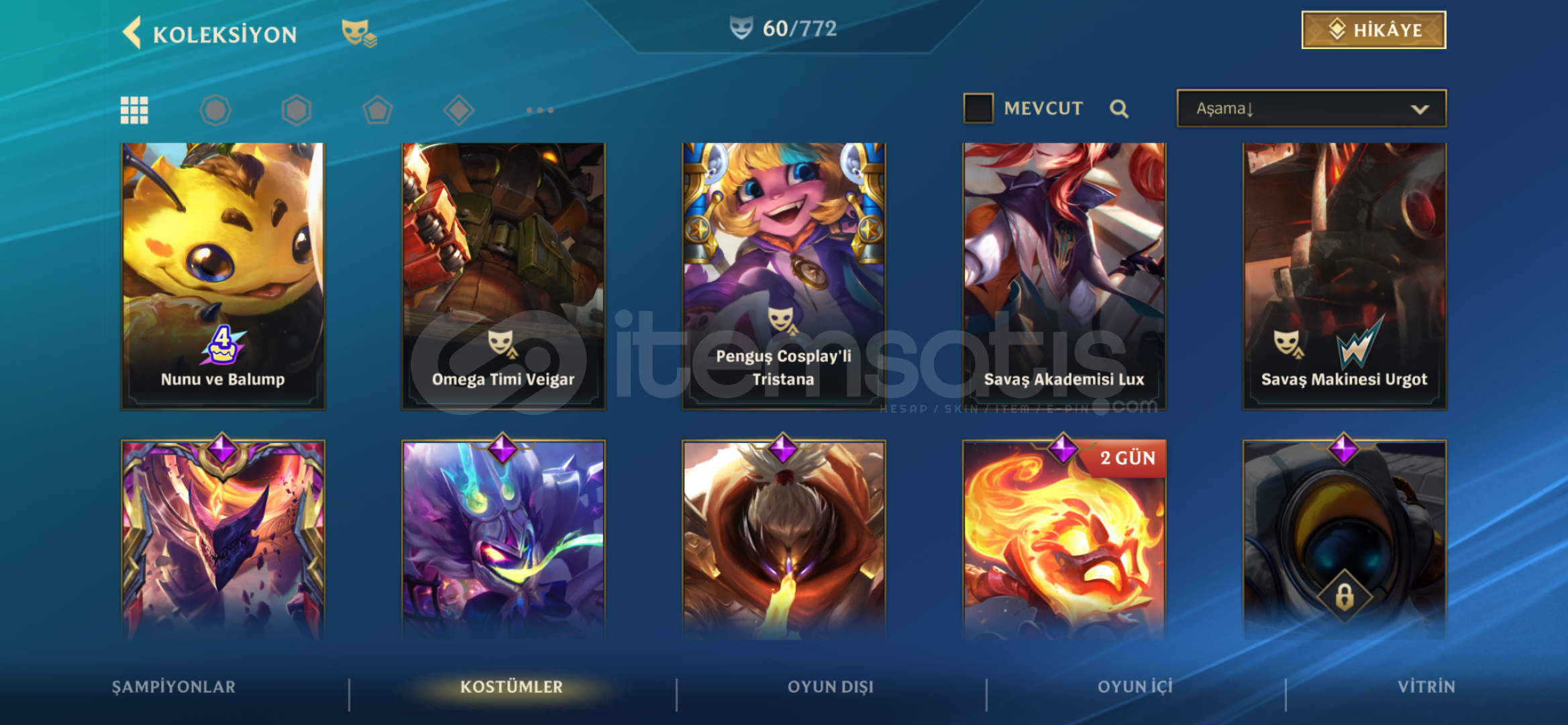 Hesapta 91 karakter 60 kostüm +23k mavi öz vardır bunların yanı sıra birçok çerçeve,flama vs. Bulunmaktadır isteyene detaylı bilgi verilir