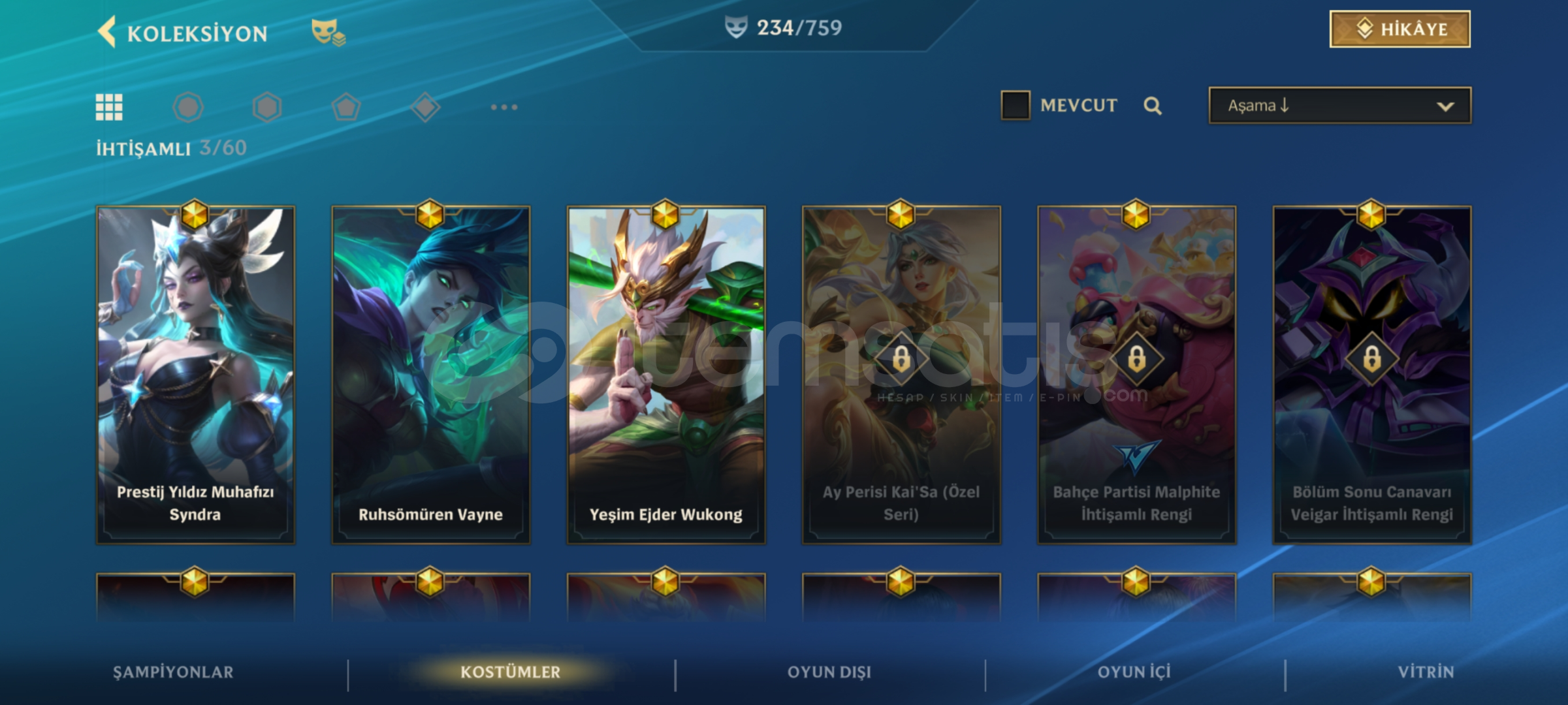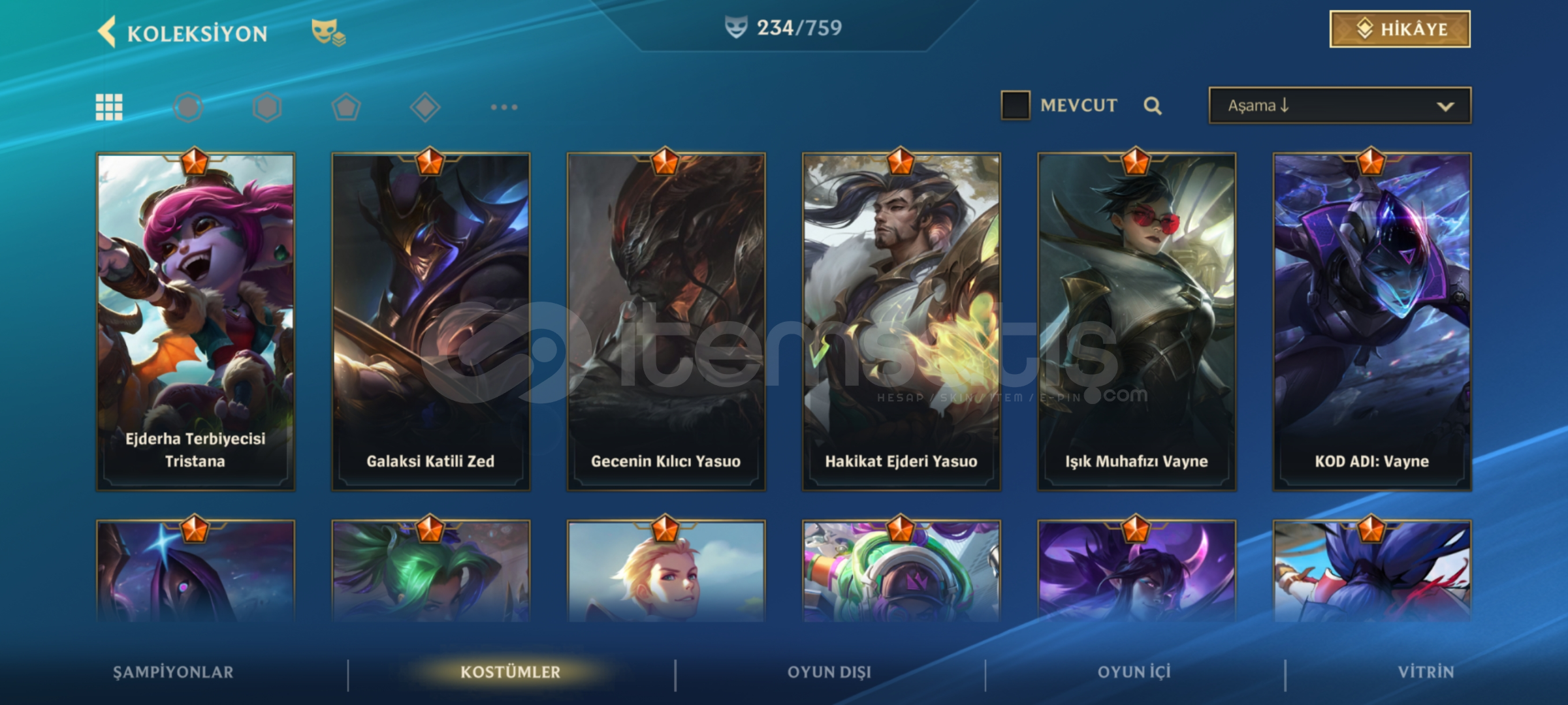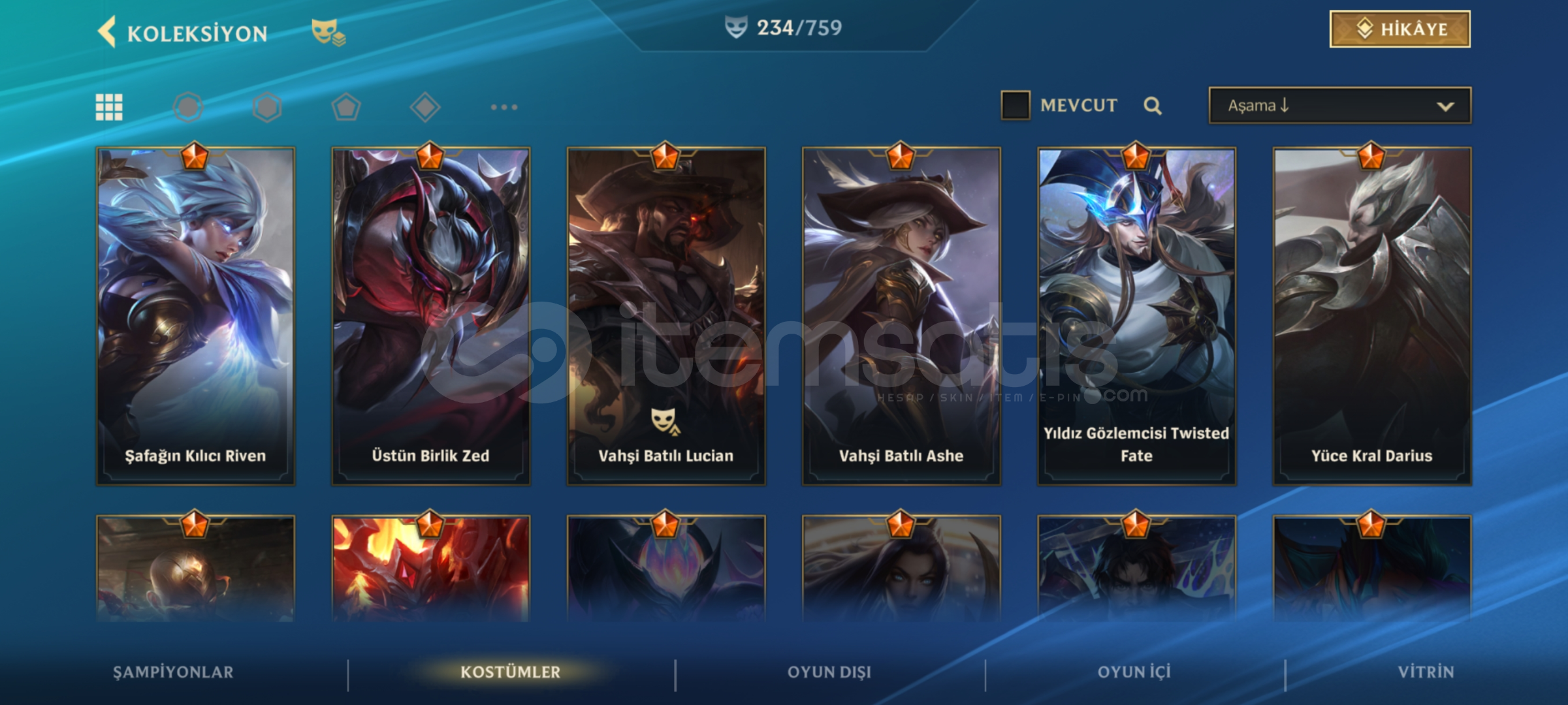 Merhabalar Oyunu bıraktığım için Sezon2 den beri oynadığım hesabı satıyorum Hesap 279 seviyedir Nick : C A P İ T A N 0 7 Nick değiştirebilirsiniz Tüm şampiyonlar açıktırİcerisinde 472.583 mavi öz vardırİçerisinde toplam 234 adet kostüm vardır 3 tanesi ihtişamlı Prestij Yıldız muhafızı syndra Ruh sö...