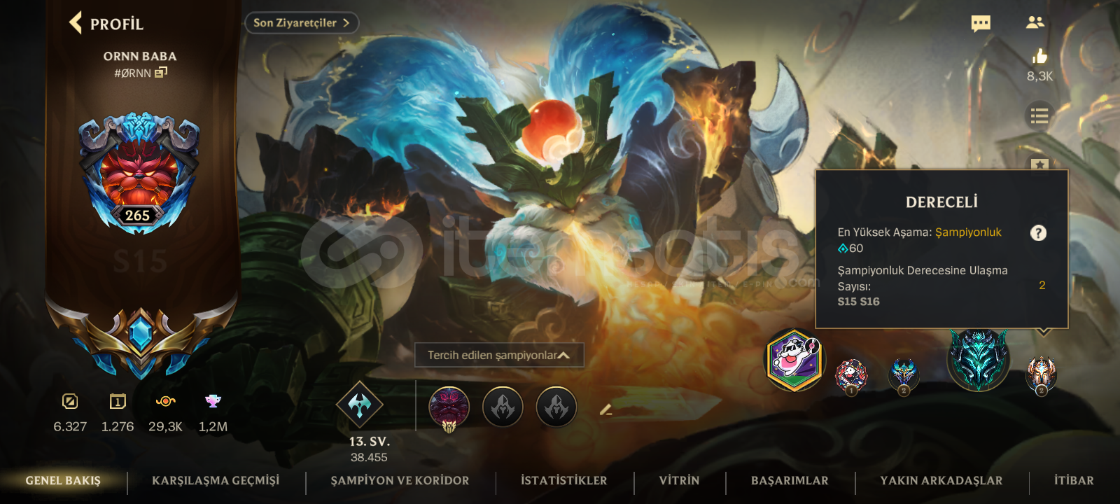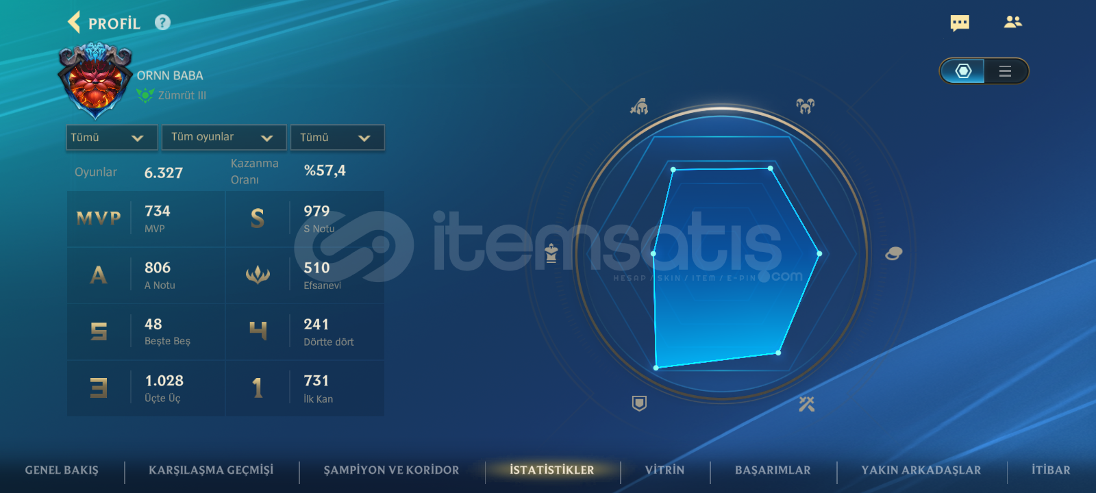 265 lvl150k mavi öz Tüm şampiyonlar alınmış 30k koleksiyon (wild pass ler alınmış full)15-16 sezon Challenger (bu sezon hiç oynamadım hesapta geri kalan önceki sezonlar grand Master -master arası )30 k koleksiyon ve wild pass kartları full var kesinlikle kaçırmayın Rahat 3k saatim var ve sorulara açığım yazabilirsiniz.
