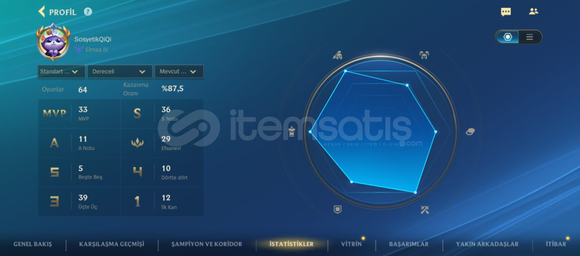 Kendim kastım yüksek kazanma oranlı temiz hesap hiçbir chat ban, afk, veya başka ihlali yoktur. Alınabilecek tüm ödüller de toplanmıştır.Satın aldığınız zaman hesap bilgileri size 3 saat içinde iletilir şifre ve maili değiştirebilirsiniz.