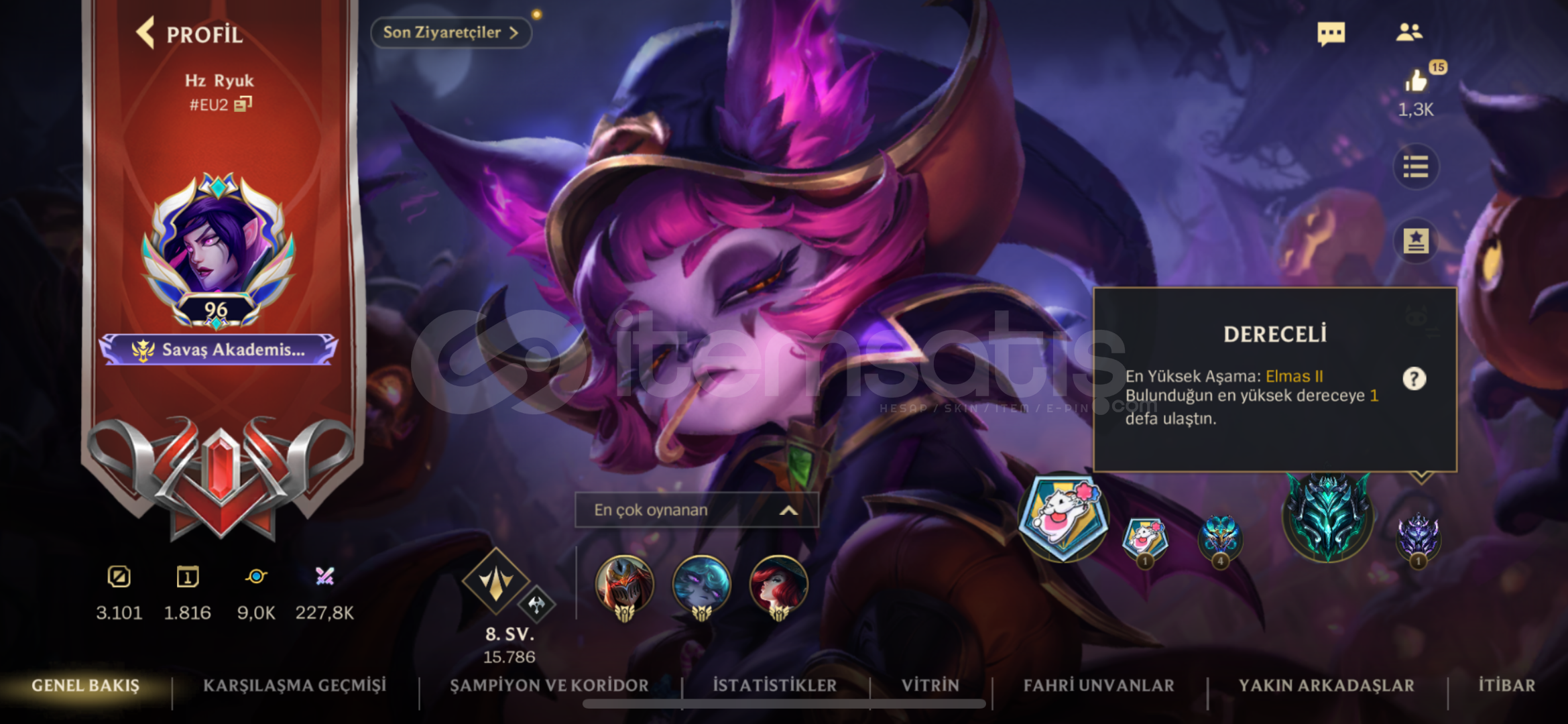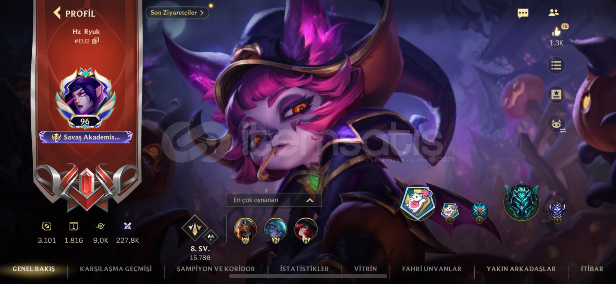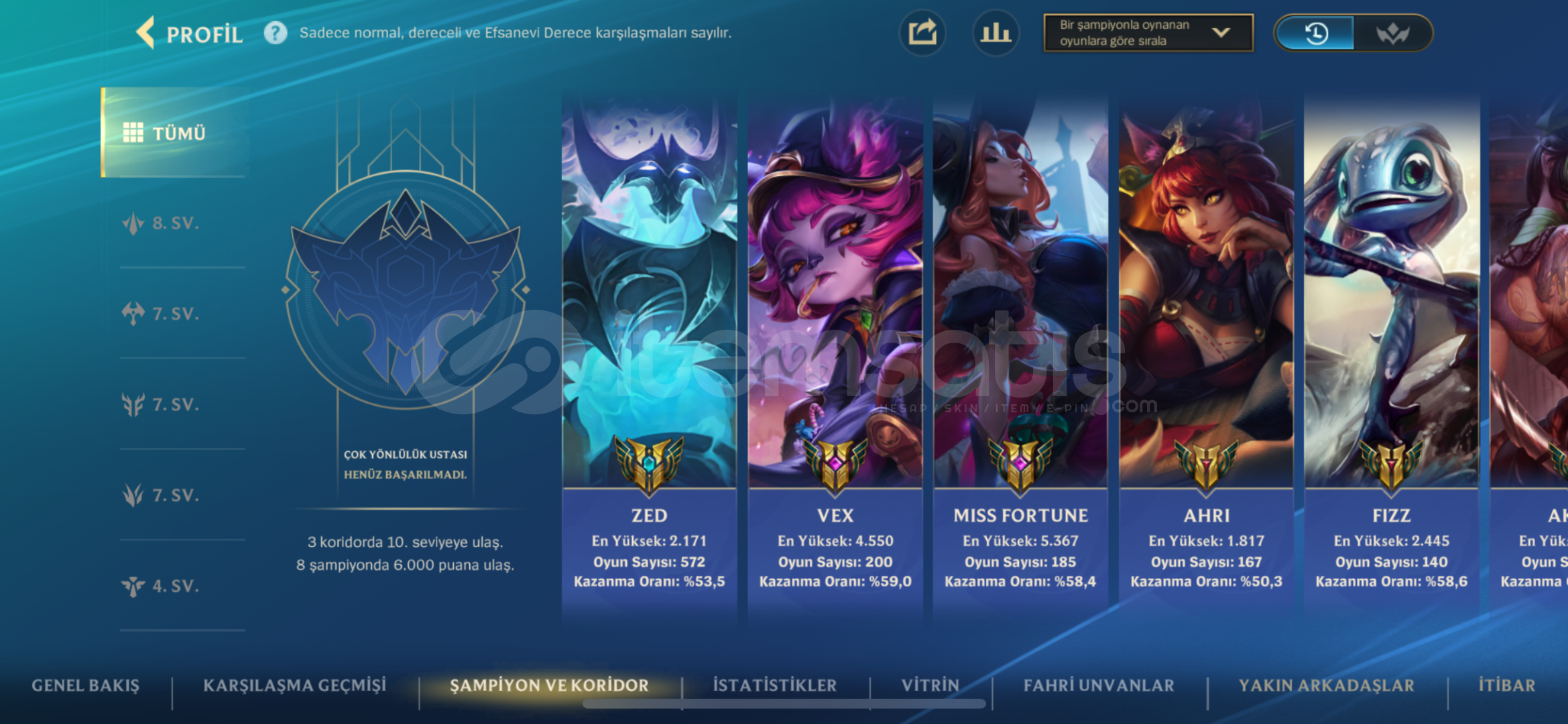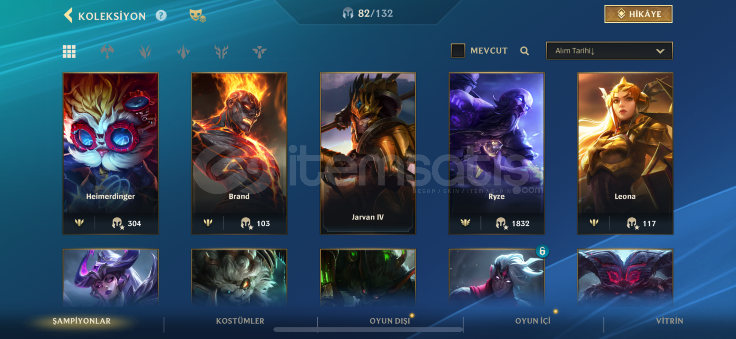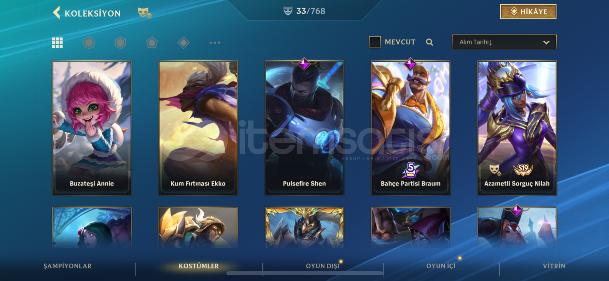 82 şampiyon 33 kostüm içinde pahalı olanlarda var para ile alınmış elmas 2 ligini gormuş şu an zümrüt 2 3 yıldızda 1810 günlük hesap … ilk hesaplardan orta koridora ağırlıklı hesap şampiyonaların %70o açık içinde 35k mavi öz vardır 7 sampiyon daha alınabilir