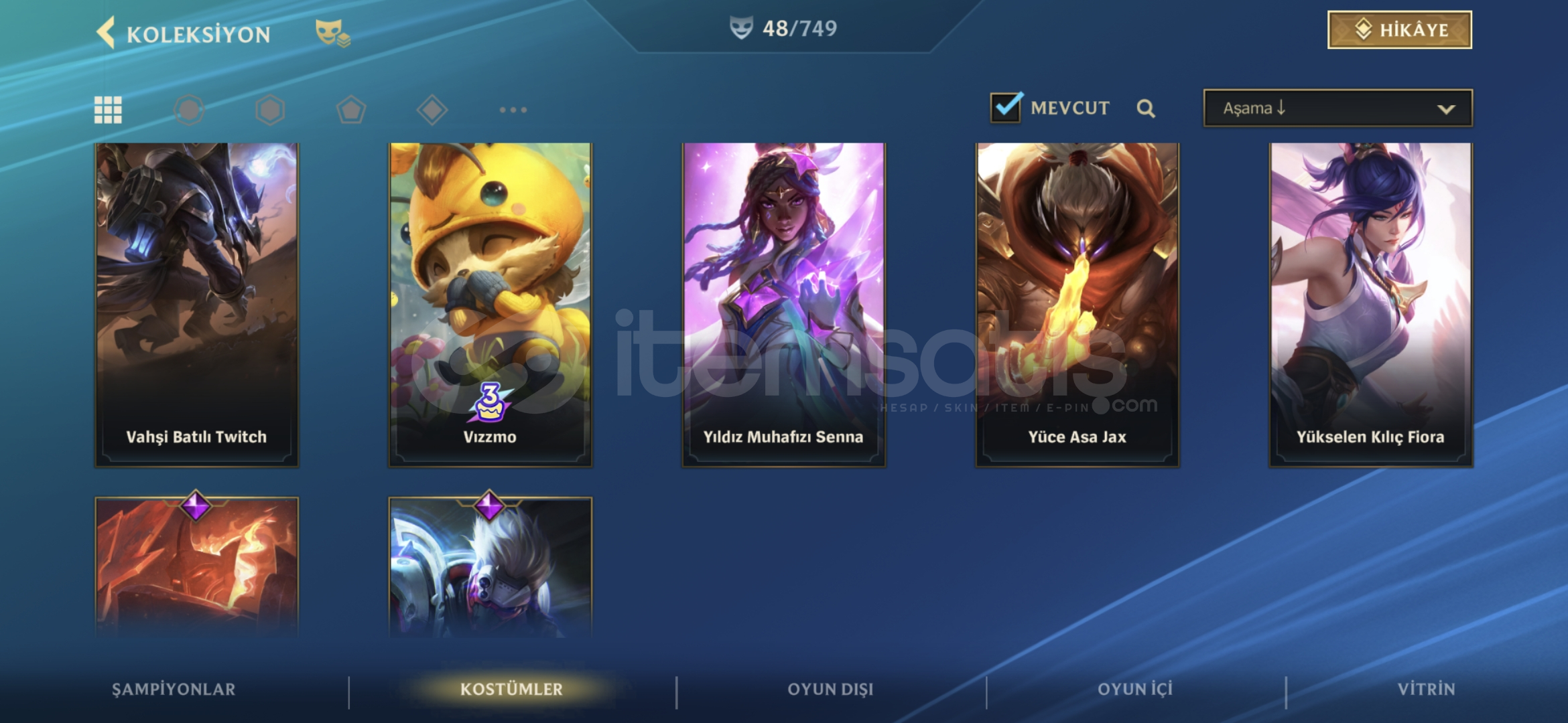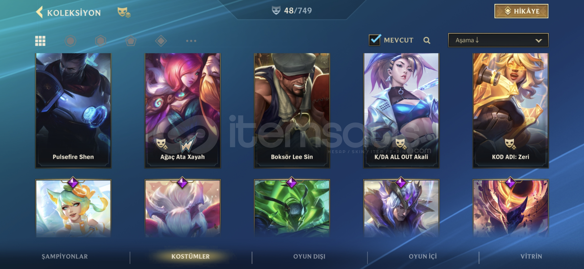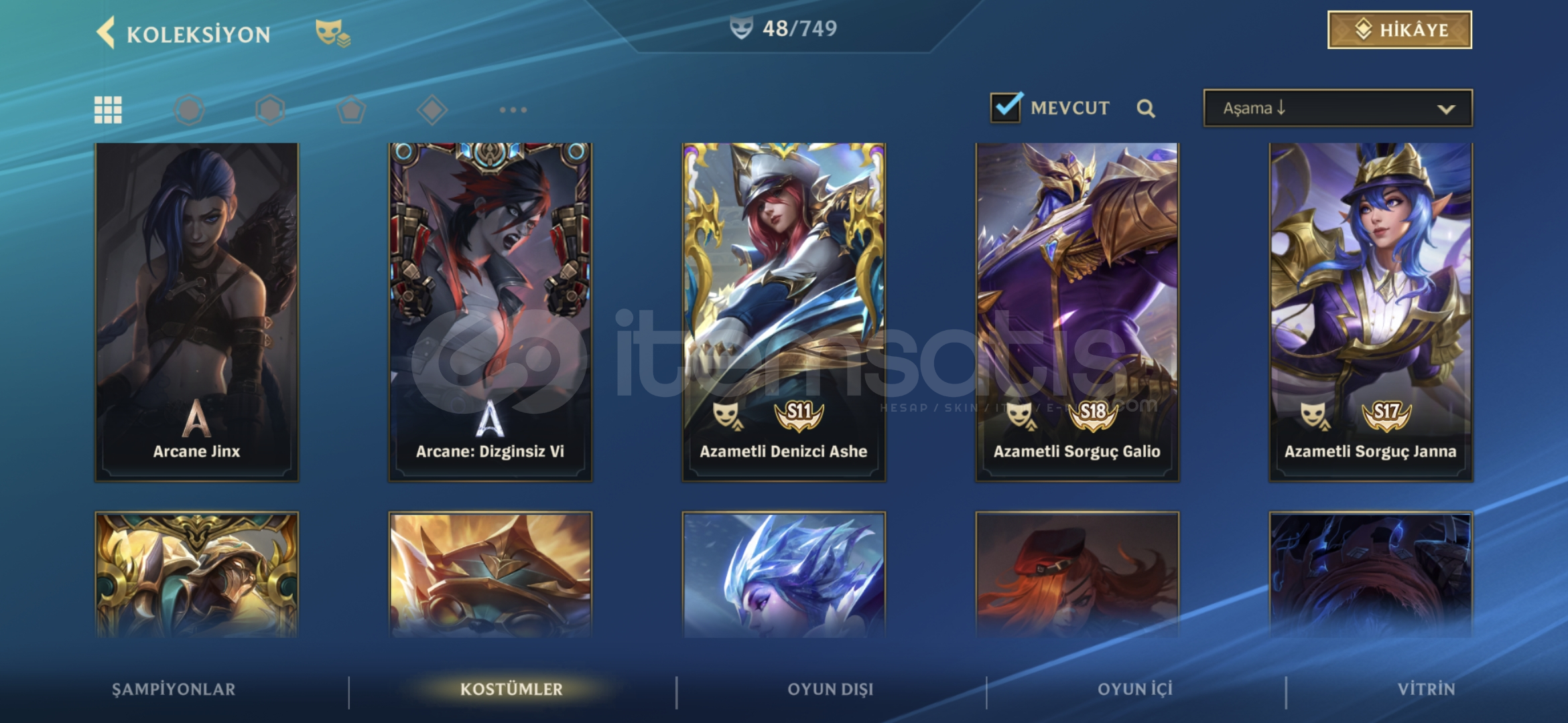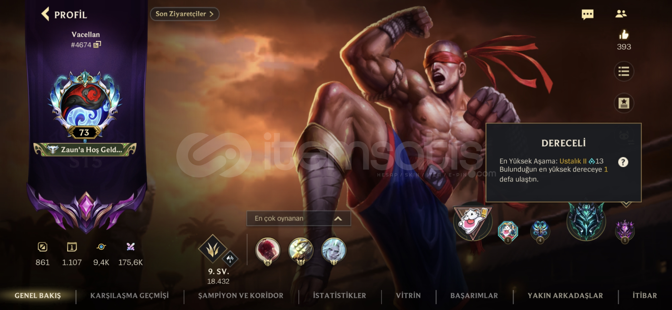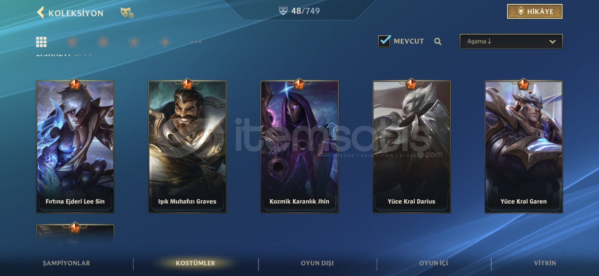 Hesap maili ile birlikte verilecektir.İsterseniz maili kendinize göre değiştirebilirsiniz.🏆 Güncel Rank: Zümrüt 🔥 Maksimum Ustalık: Ustalık 2 💎 Seviye: 73 👑 Kahraman Sayısı: +70 🎭 Kostüm Sayısı: 48🌈 Değerli Kostümler: ✨Fırtına Ejderi Lee Sin ✨ Işık Muhafızı Graves ✨ Kozmik Karanlık Jhin ✨ Yüce Kral Dari...
