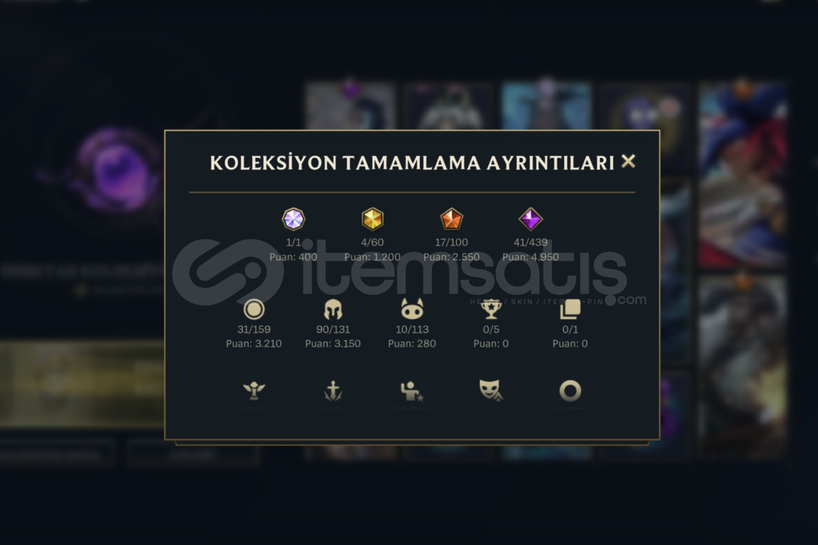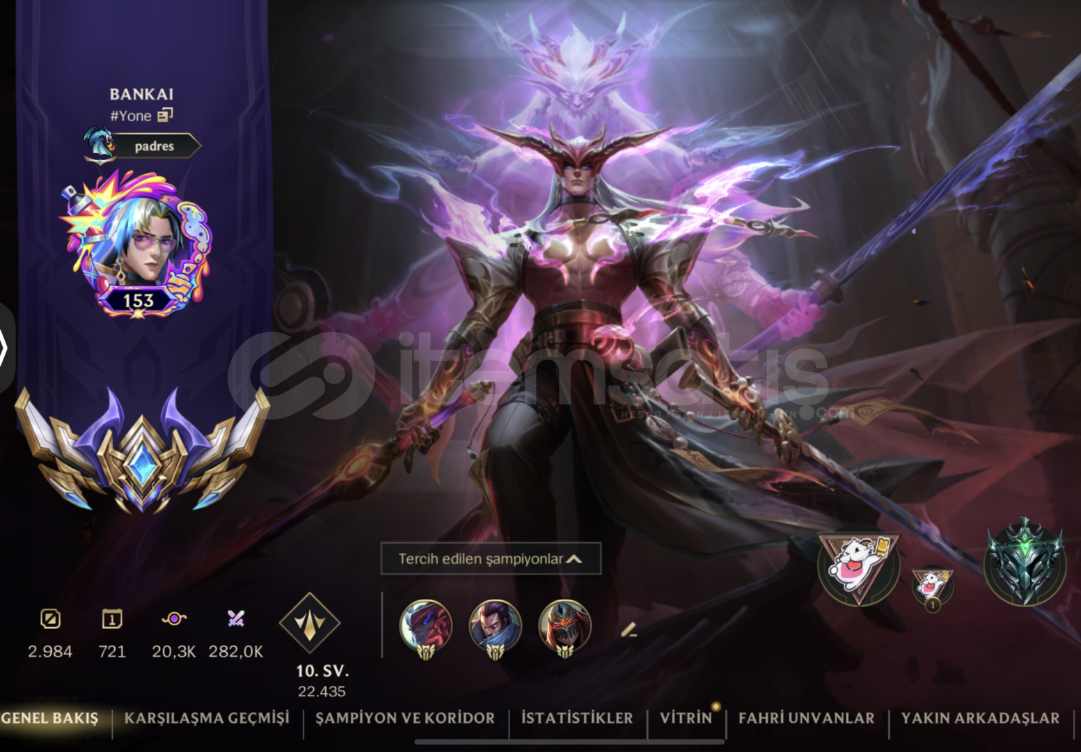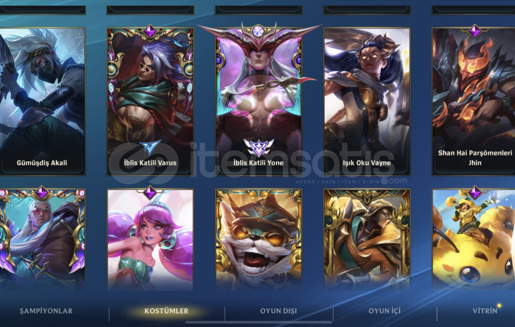1 ebedi kostüm = iblis katili yone 4 ihtişamlı kostüm = prestij yasuo,prestij yone,ruhsömüren vayne,yz jinx.17 Efsanevi kostüm 41 destansı kostümHesap 153 seviye itibar puana biraz düşükAllana hayırlı olsun öğrenmek istediğiniz birşey olursa yazınız.