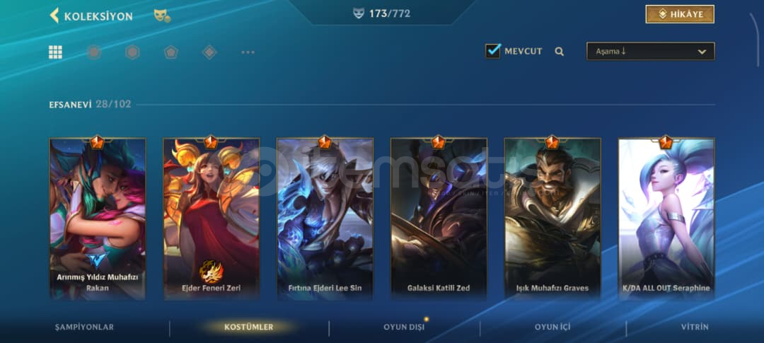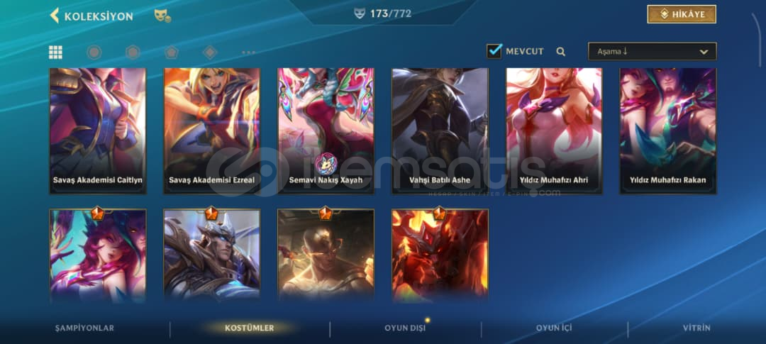 Wild rift hesabında resimlerde de görüldüğü üzere 173 kostüm vardır.