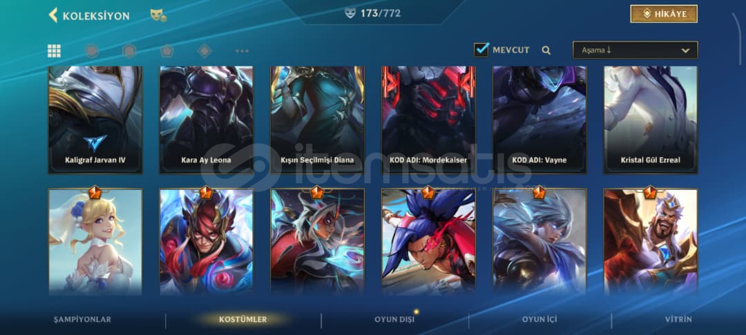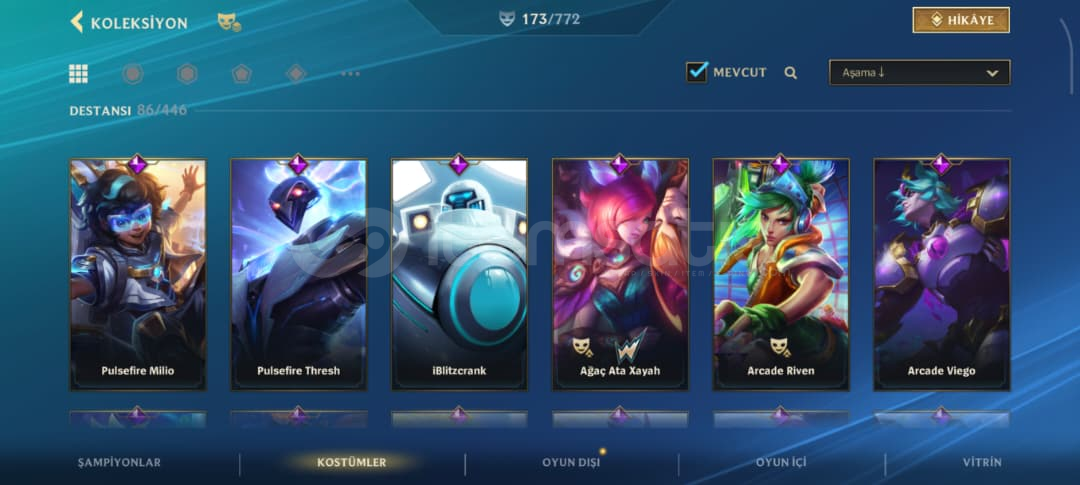 Hesap Challenger görmüştür.Wild rift hesabında resimlerde de görüldüğü üzere 173 kostüm vardır.3 İhtişamlı (Sarı)28 Efsanevi (Turuncu)86 Destansı (Mor)Hesap derecesiz ve takdiri 3. seviyedir.117 level lol hesabı vardır, içinde 36 adet skin bulunmaktadır. 2 İhtişamlı, 3 Efsanevi, 17 DestansıHesaptan yana hiçbir sıkıntı yoktur, ban yahut ihlal ye...