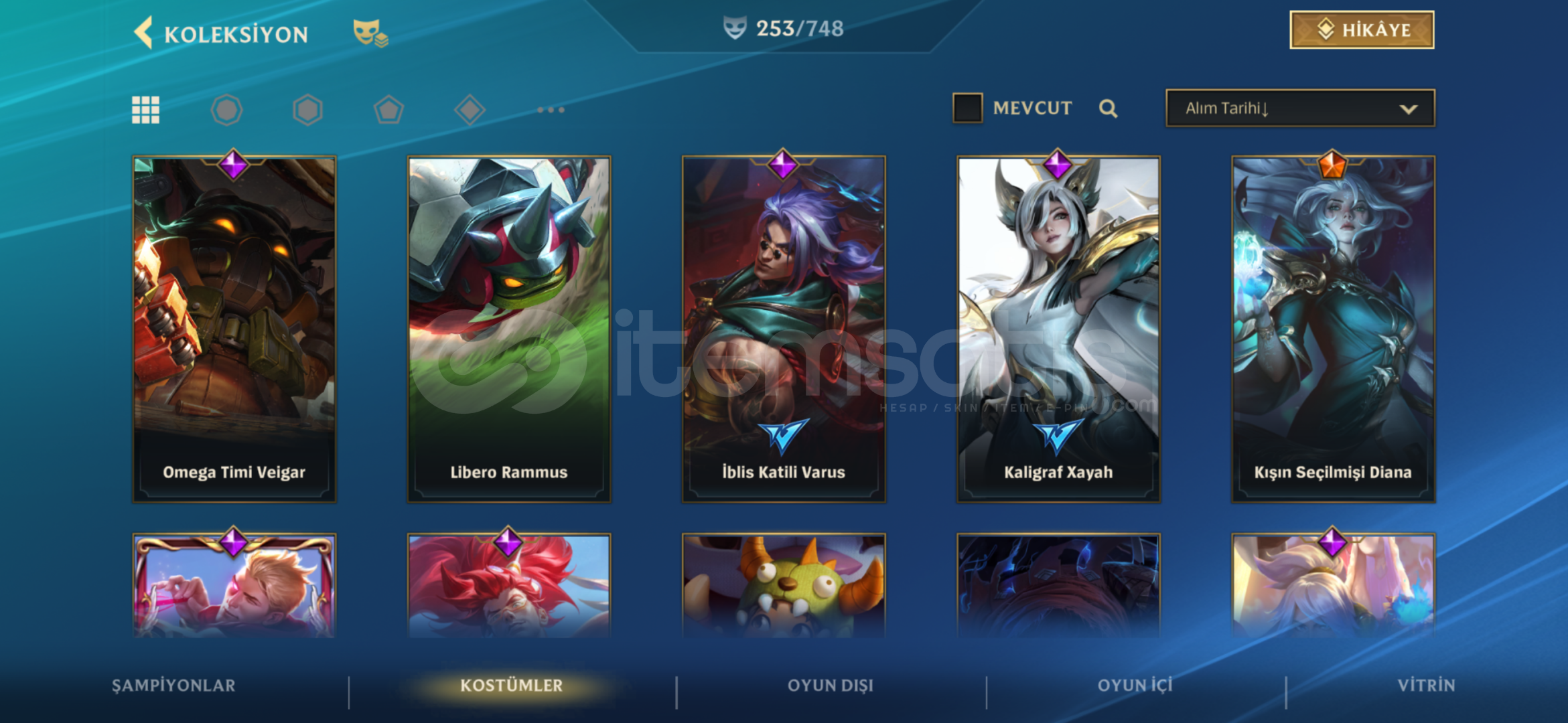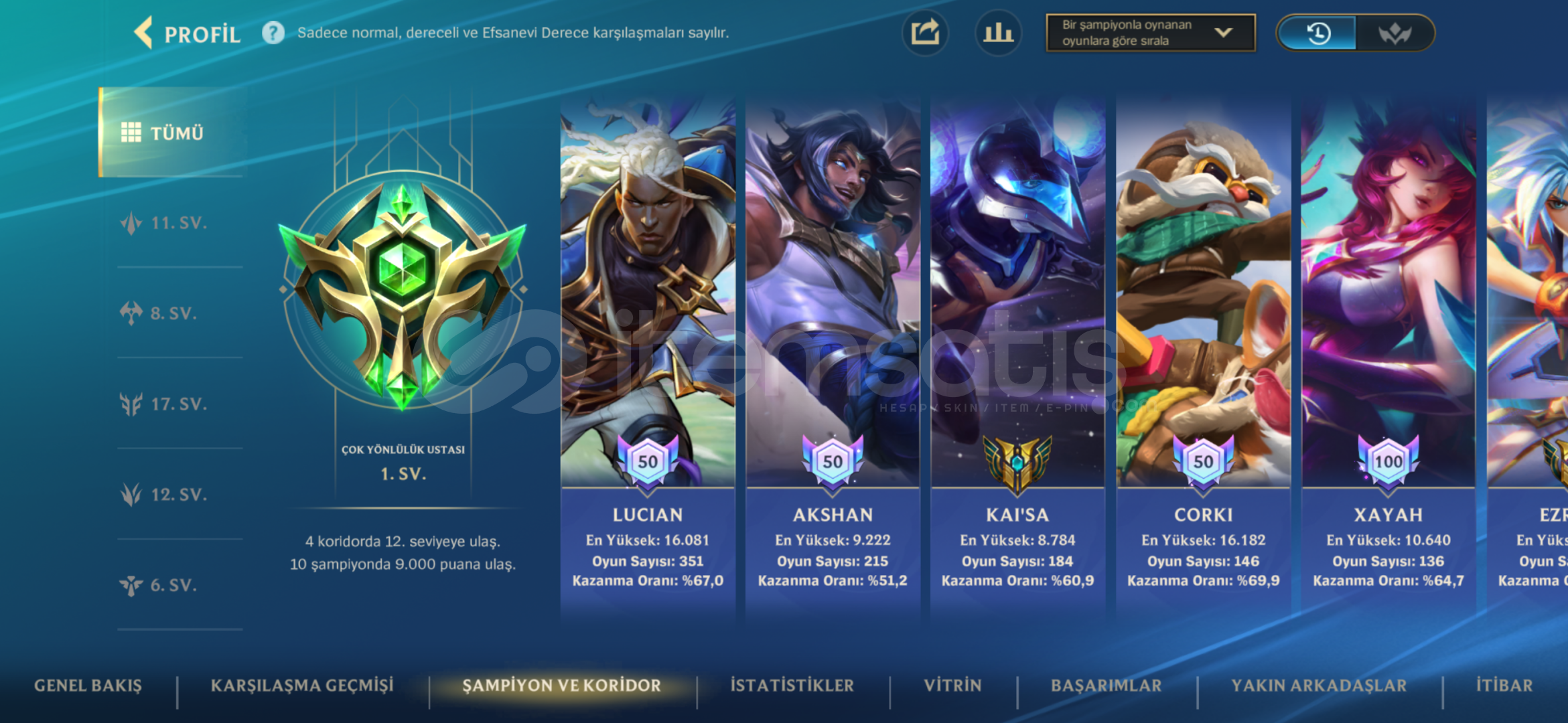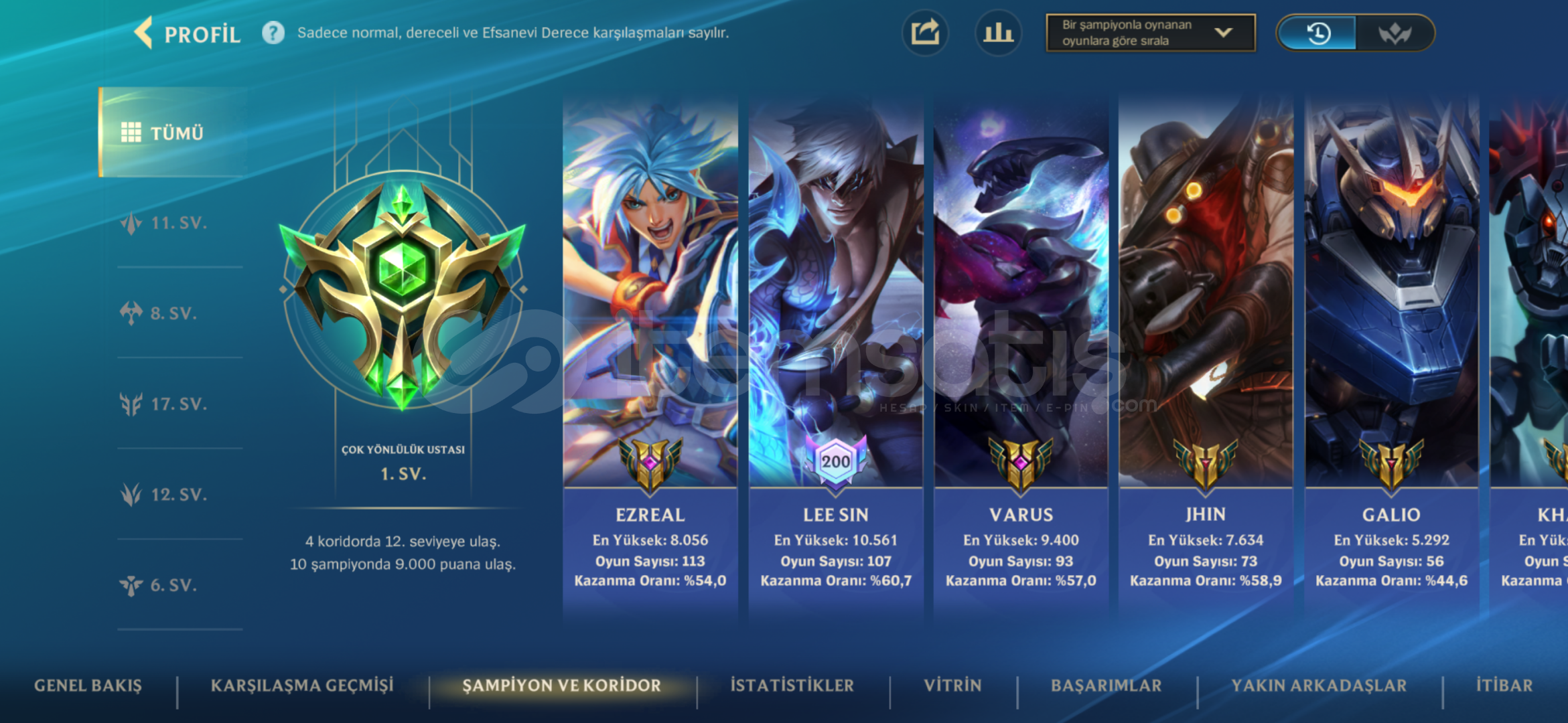HESAP İMPARATORLUK VE EFSANE LİGİNE ÇIKMIŞ OLUP SANCAKLARI ALINMIŞTIR HESAP AĞIRLIKLI OLARAK ADC KOSTÜMÜ HER ADC DE KOSTÜM VARDIR KAZANMA ORANLARI YÜKSEKTİR 253 KOSTÜM 100 ŞAMPİYON VARDIR KOSTÜMLER DEĞERLİ KOSTÜMLERDİR ŞUANDA S18 ŞAMPİYONLUK LİGİNDEDİR. DETAYLI BİLGİ İÇİN İLETİŞİME GEÇİN.