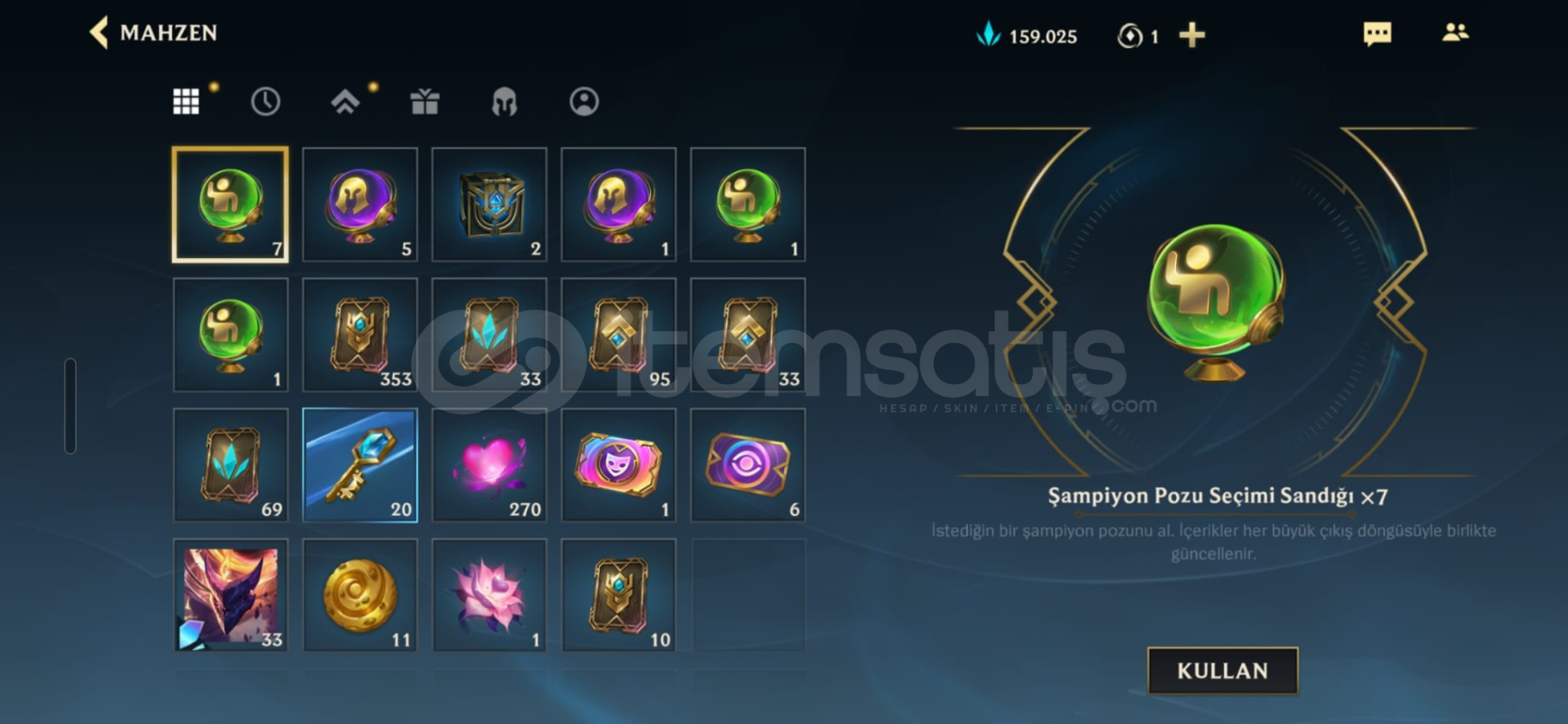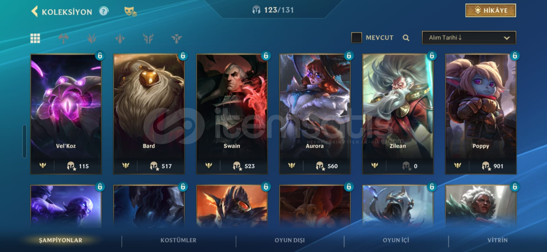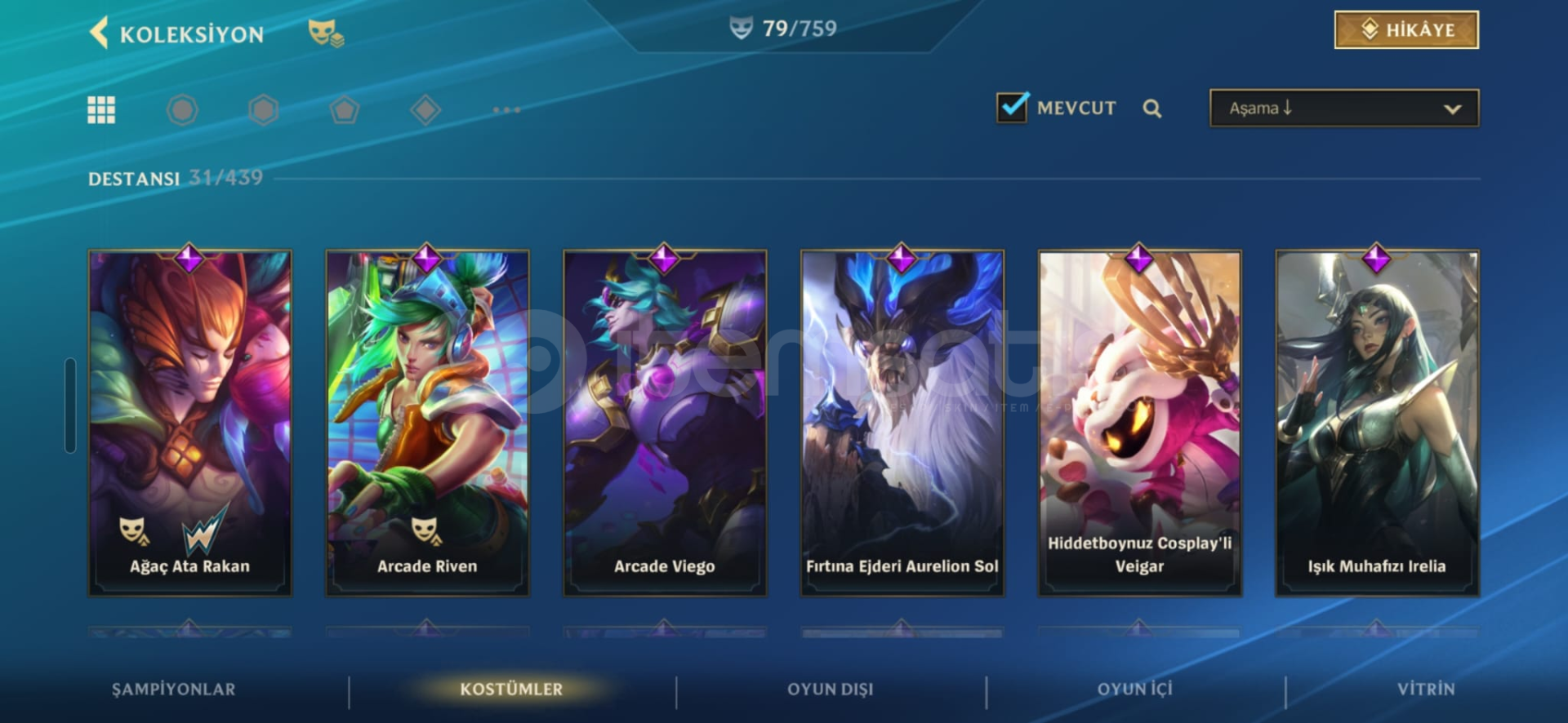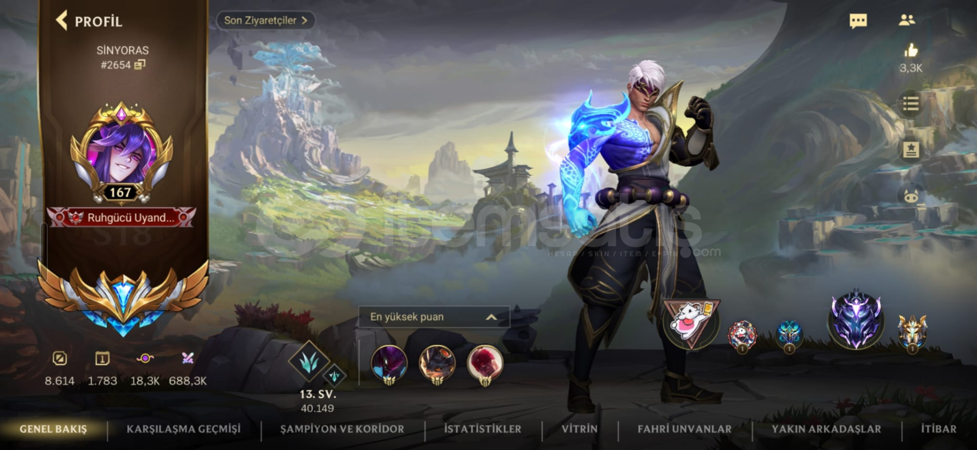📈 Hesap Bilgileri:Seviye: 167Lig: 18. Sezon Şampiyonluk Ligi (şu anda Elmas)Şampiyon Sayısı: 123 (kalanlar isteğe göre kolayca alınabilir)Kostüm Sayısı: 798 Adet Efsanevi KostümMavi Öz: 155.000+Hesap aktif olarak oynanmış, tüm detayları özenle geliştirilmiştir.🔥 Ek Bilgiler:Hesap, düzenli oynanmış ve iyi durumdadır.Şampiyonluk ligine çıkmı&...