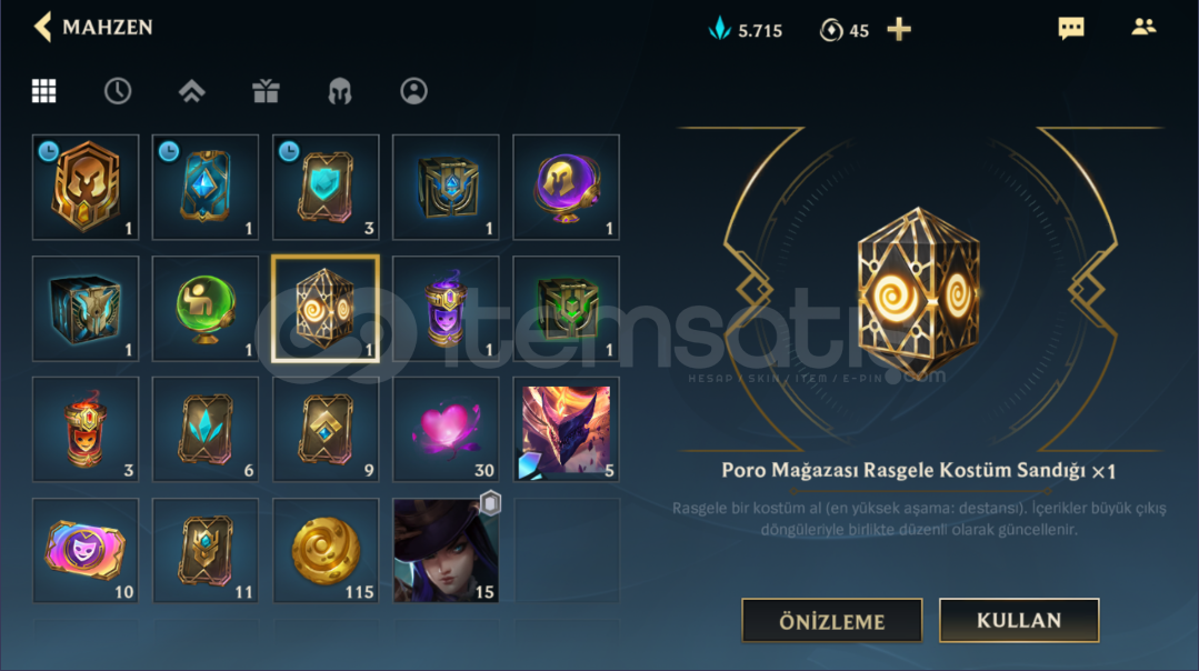32 LevelZümrüt Düşmesi Altın5kMavi öz 45Vç100 Poro Enerjisi3x Ay Festivali Rasgele Kostüm Sandığı1x Poro Mağzası Rasgele Kostüm Sandığı1x Rasgele Kostüm Sandığı1x Şampiyon Sandığı33 Şampiyon 16 KostümEposta Şifre Değiştirebilrisiniz