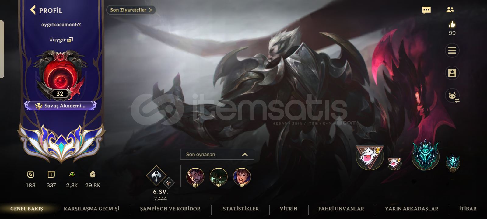 Hesapta baron ve JUNGLE oynanmıştır. Darius oynayanlar için tam anlamıyla mainlik hesaptır. Fotoğraflarda göremediğiniz hesapla alakalı bir sorunuz varsa mesaj gönderebilirsiniz.Pazarlık mevcut.Tek bağ, hesabı sizin üstünüze yapacağım.