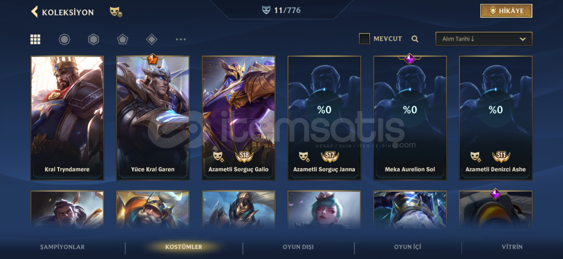 ⭐ Hesapta Bulunan Özel Kostümlerden Bazıları:👑 Kral Tryndamere⚔️ Yüce Kral Garen🛡️ Azametli Galio (S18)🌪️ Azametli Janna (S17)🐉 Meka Aurelion Sol🏹 Azametli Denizci Ashe (S11)