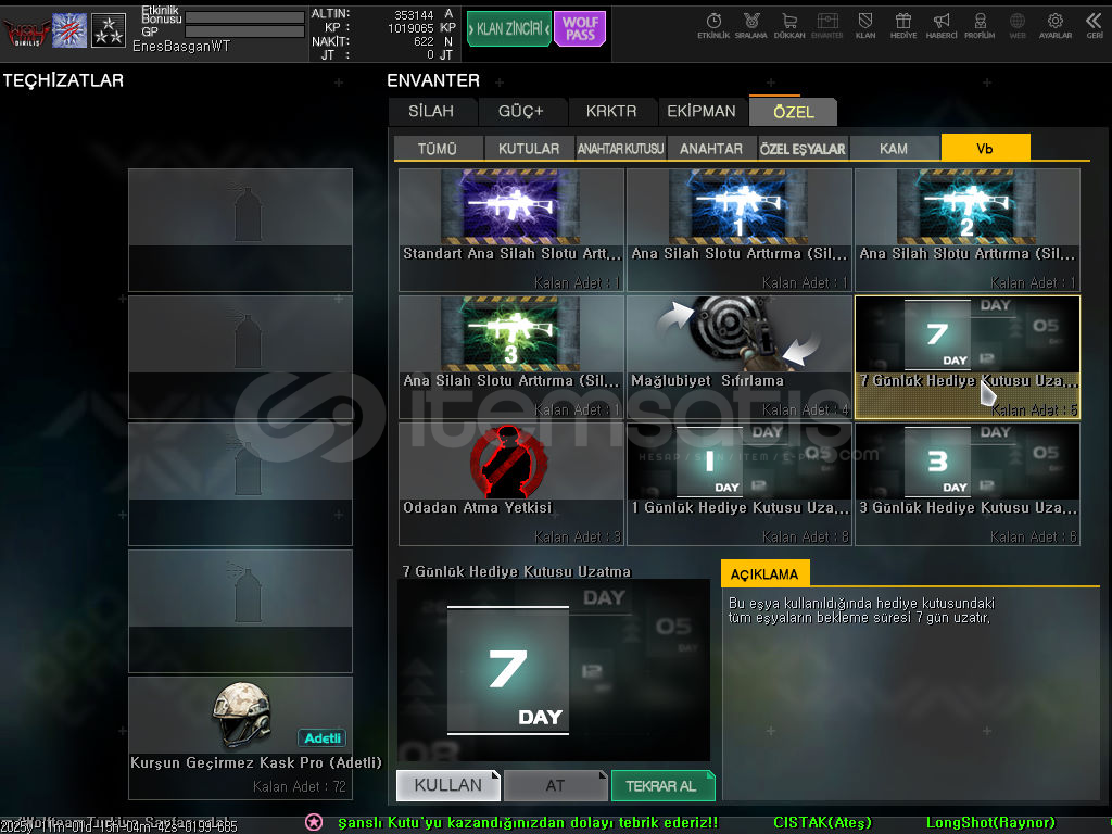 Satın al butonuna tıkladığınızda Kullanıcı Adı:ŞifreOyun İsmi, (varsa) Klan İsmi ve Rütbe olarak teslim edilmektedir.