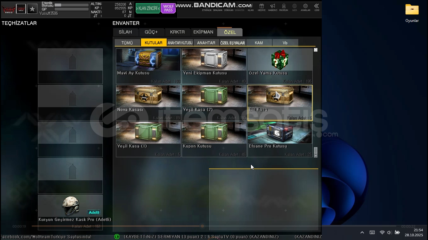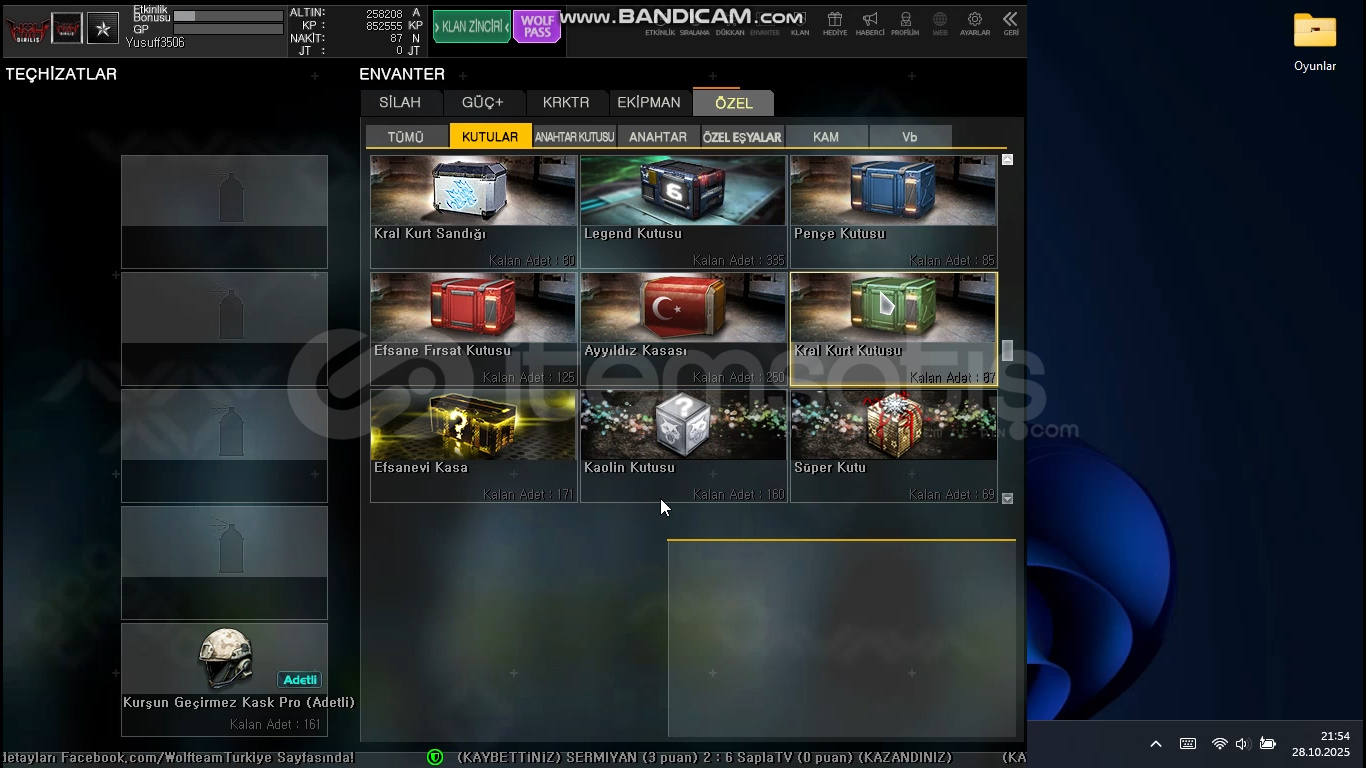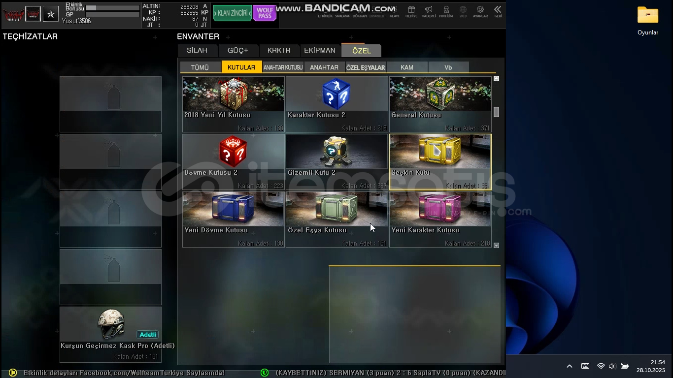 HESABIN KUTULARI OLDUKÇA BOLDUR SEÇKİN KUTU 350 TANEDİR LEGEND KUTUSUDA ÇOK FAZLADIR.HESAPTA 6 GÜNLÜK OG PRO DÖVMESİ VARDIR HIZLI OLAN ALIR.HESABIN HEDİYE KUTUSU DA ÇOK BOLDUR SÜRELERİ DE BAYA VARDIR.2 VEYA 3 MASTER (SARI) KART VARDIR.TAKLASI ŞUAN 69 GÜNDÜR TAKLA ÇIKAN KUTULAR ÇOK FAZLA VARDIR.HESAPTA TÜM SLOTLAR AÇIKTIR.LEGEND SİLAHLARIN DA SÜRELERİ ÇOK FAZLADI...