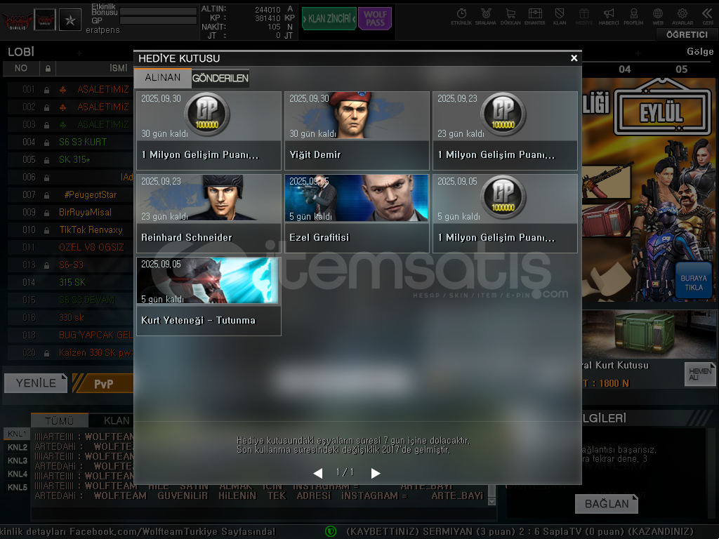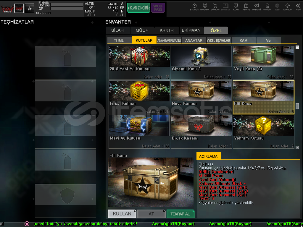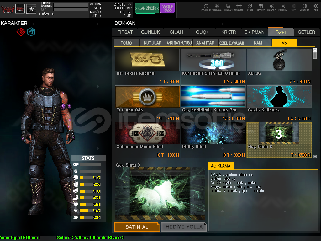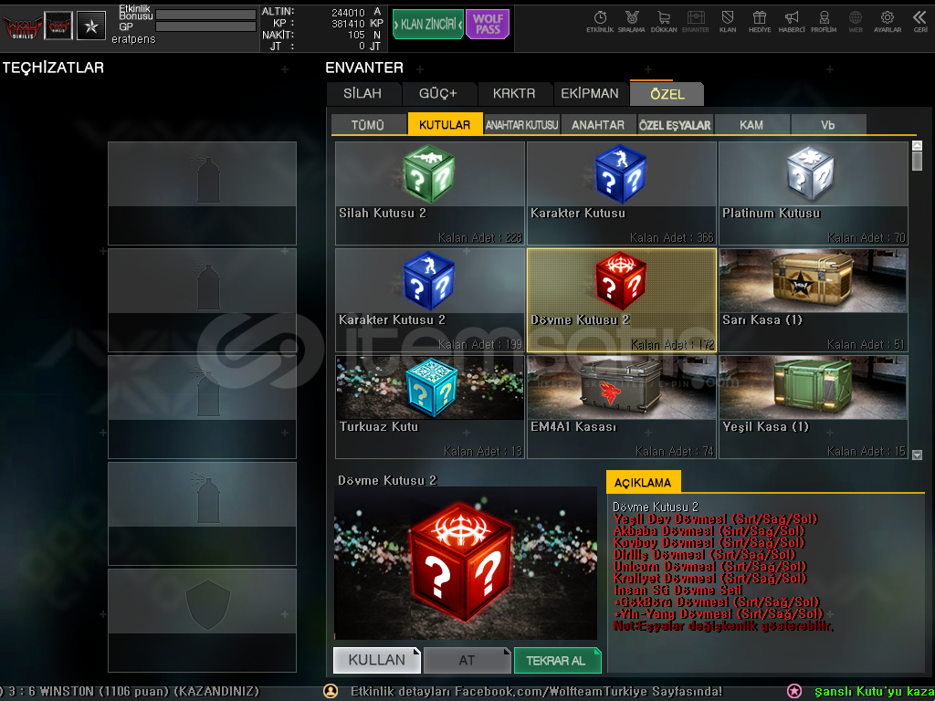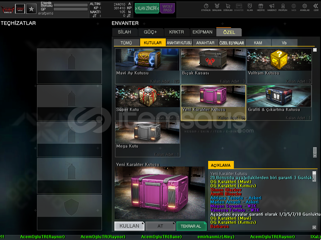 Otomatik teslimattır. Mail yoktur.2 güç slotu vardır1 silah slotu vardır.380.000 KP vardır.Karekter kutusu, dövme kutusu boldur.Platinum kutusu ve 2018 yeni yıl kutusu çöptür.