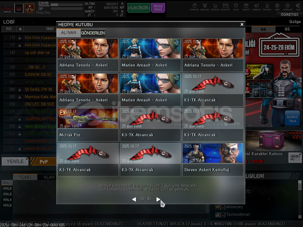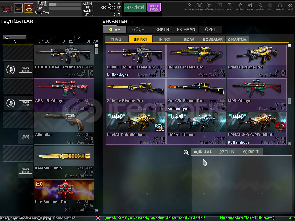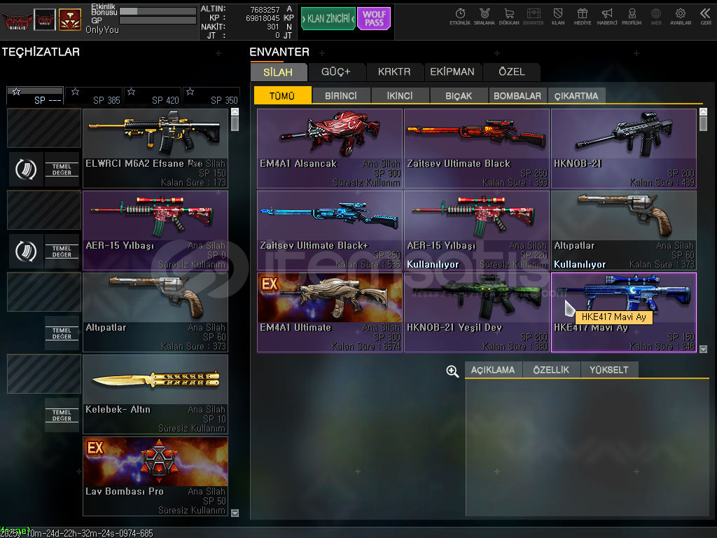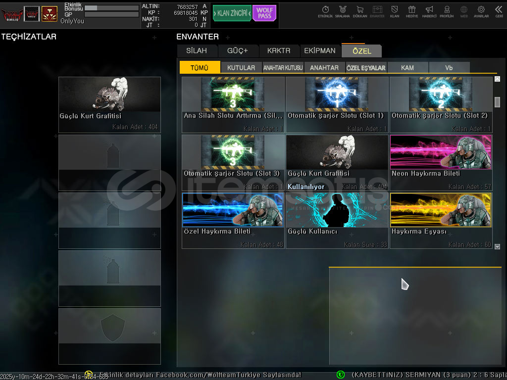 Merhabalar herkese muhtemelen oyunda bana denk geldiniz temiz oynarım hep hesabımı oyunu bıraktığım için satıyorum msn(hotmail) ile devir edicem tertemiz sorunsuzdur.6.7 tane süresizli ful slotlar açık. karakter kartarı hepsi 4 seviye. 70Milyon KP mevcuttur. bol kutulu hediye kutusu fuldur. özel isimlidir alana hayırlı olsun.