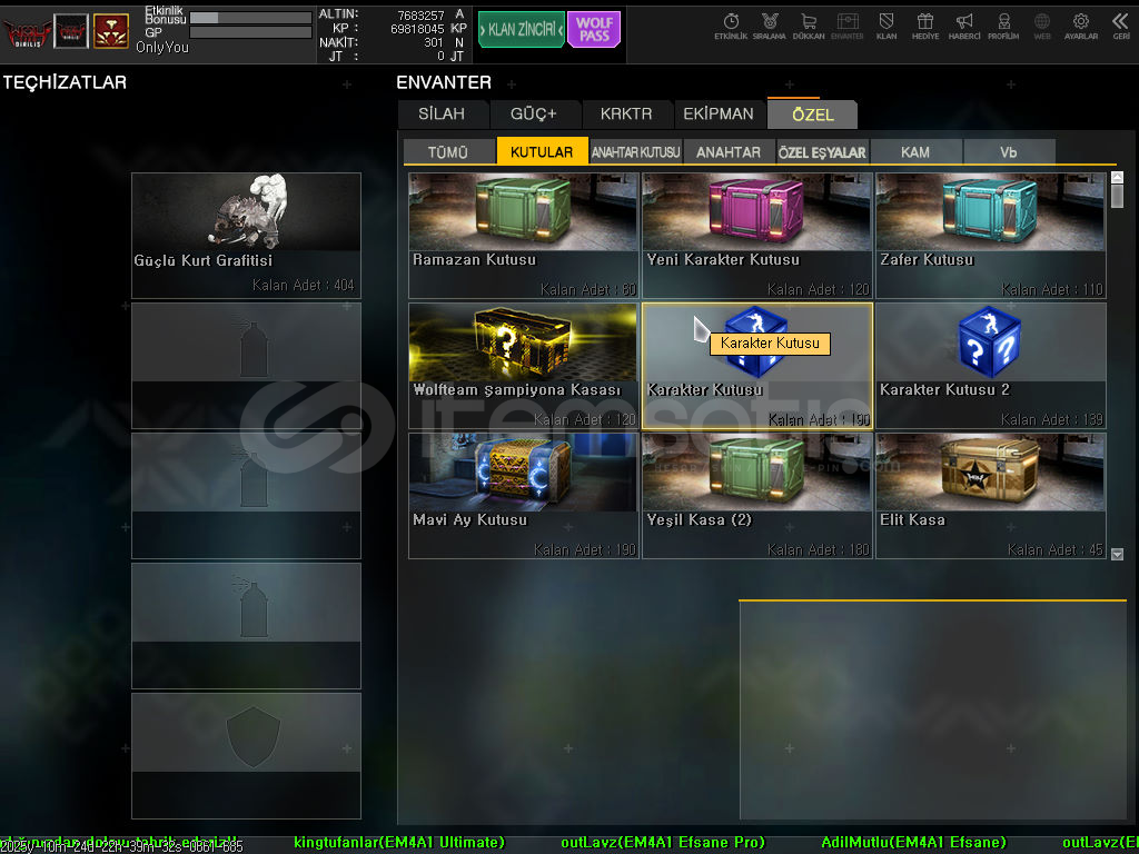 6.7 tane süresizli ful slotlar açık. karakter kartarı hepsi 4 seviye. 70Milyon KP mevcuttur. bol kutulu hediye kutusu fuldur. özel isimlidir alana hayırlı olsun.