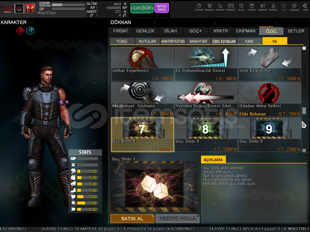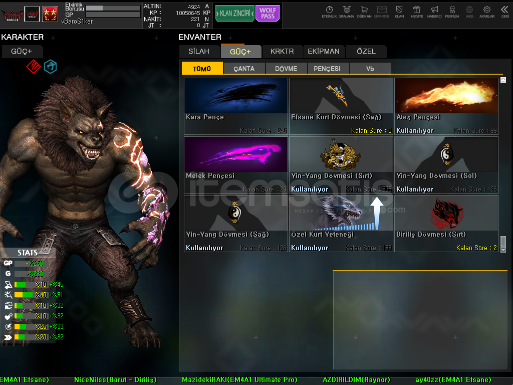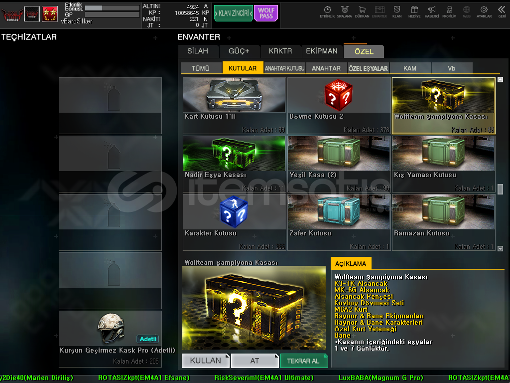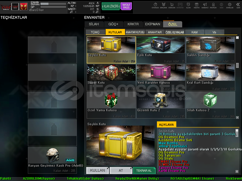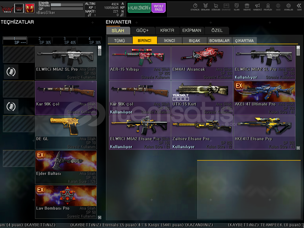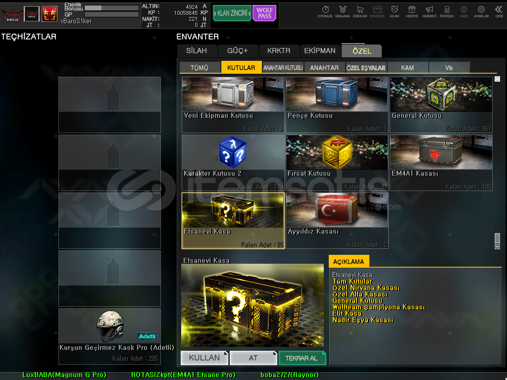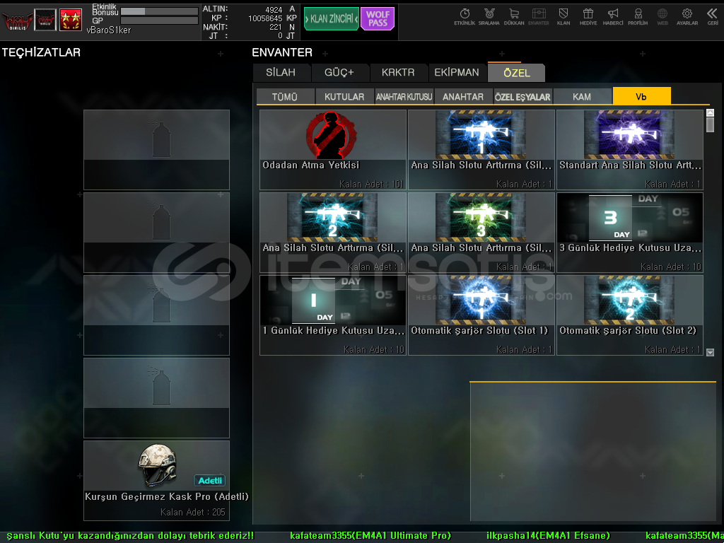 Süresiz kullanım AER-15 YILBAŞISüresiz kullanım EM4A1 ALSANCAKSüresiz kullanım Kukri YılbaşıSüresiz kullanım Lav Bombası ProSüresiz kullanım Duvar Koşusu 2. seviyeSüresiz kullanım Kurt Koruması 1. seviyeSüresiz kullanım Vampir Kurt PençesiKırmızı Karekterler : 70 günlük Rashid Neo42 günlük bane (envanterde 28 günlük ekipmanları mevcuttu...