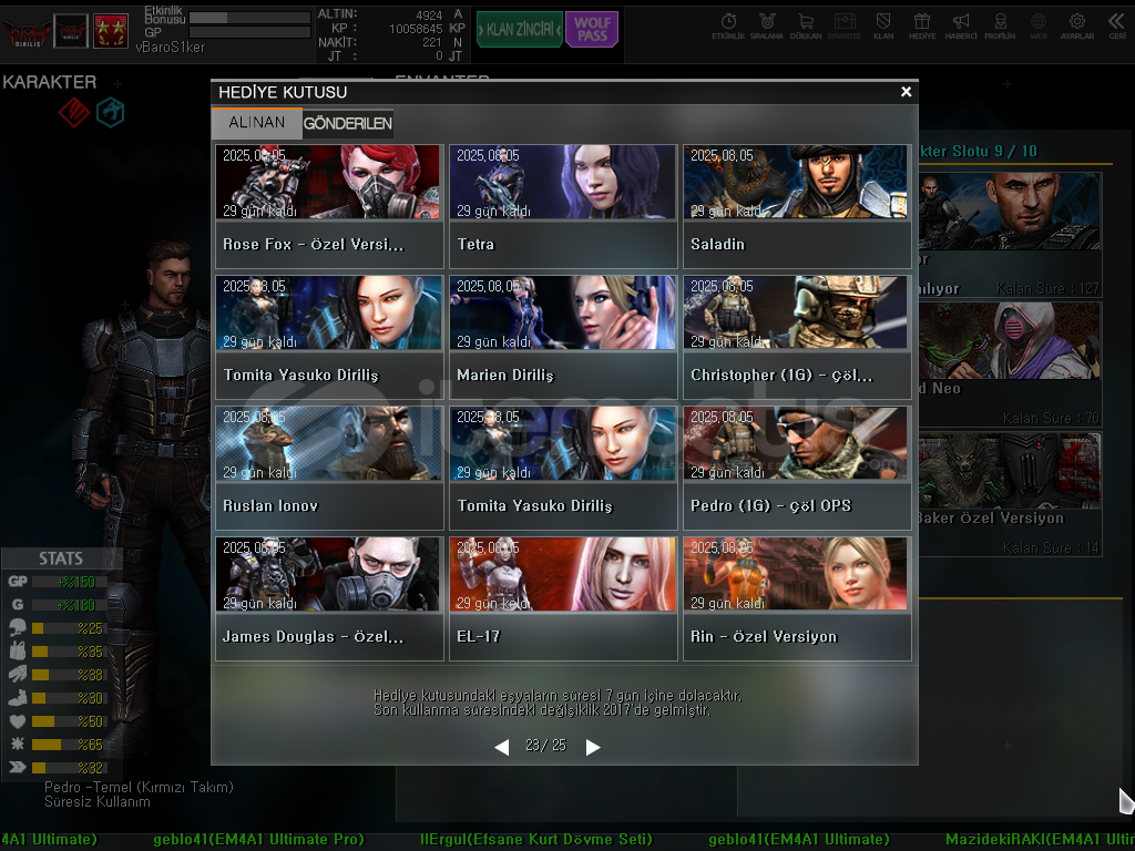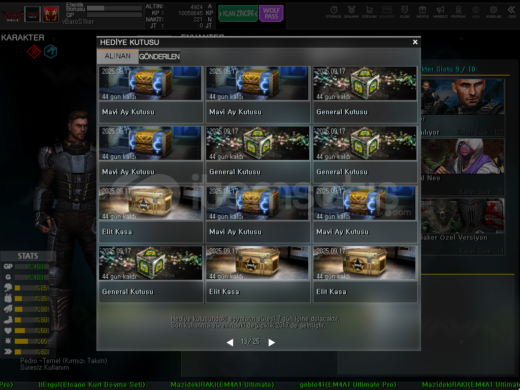 Hediye kutusunda bolca mavi ay kutusu, elit kasa, dövme kutusu 2 , silah kutusu 2, karekter kutusu, karekter kutusu 2, özel yama kutusu, general kutusu vardır. Bol bol karekter vardır.Hediye kutusu süre uzatıcı kullandığımdan son sayfadaki eşyaların süresi bile 29 gündür.