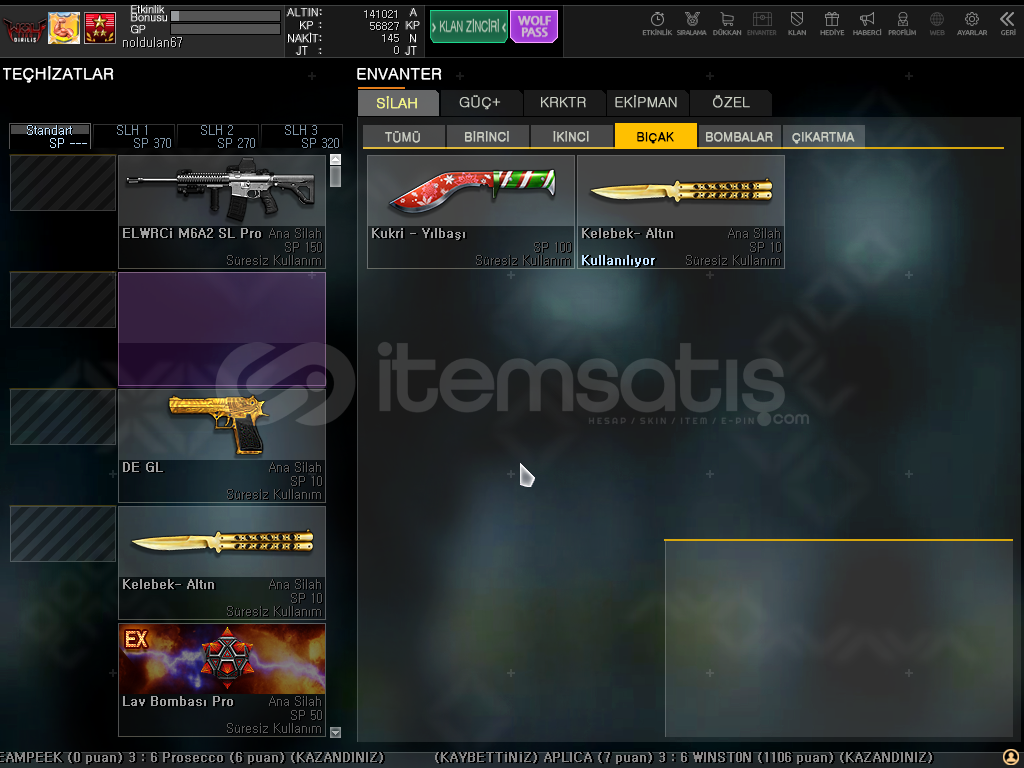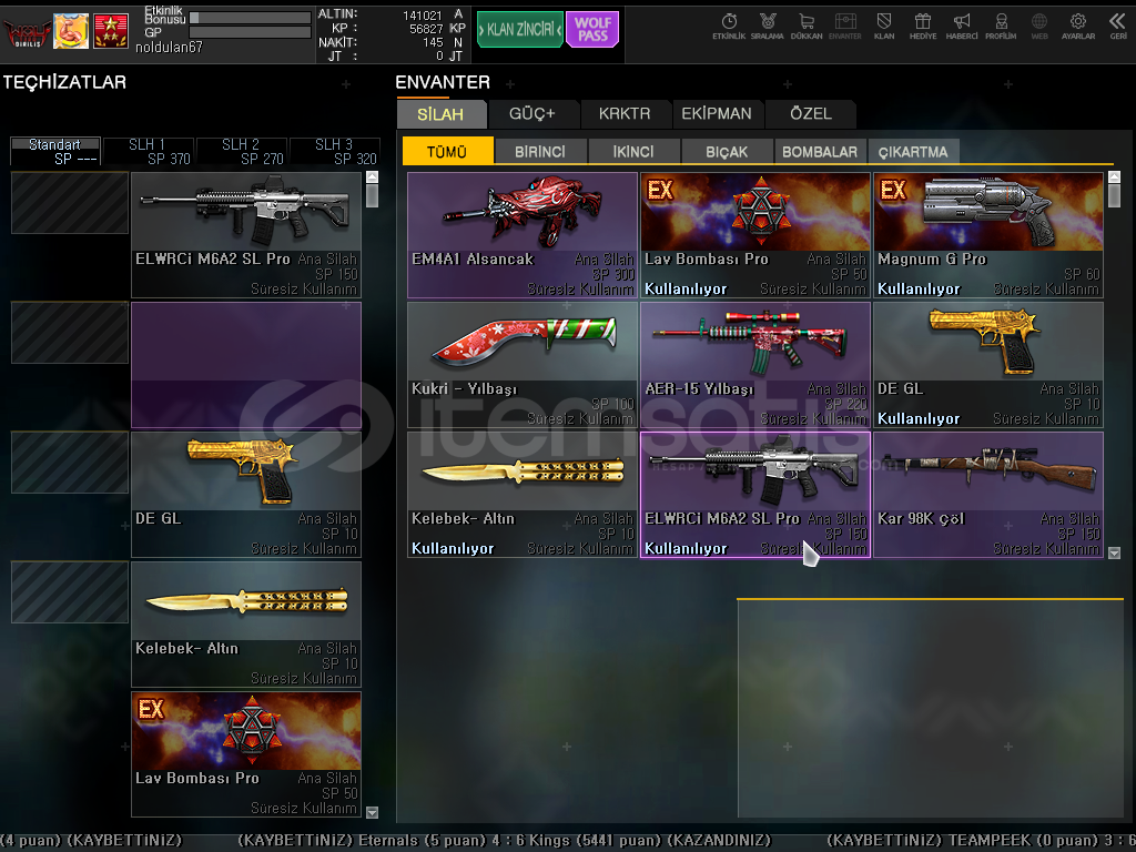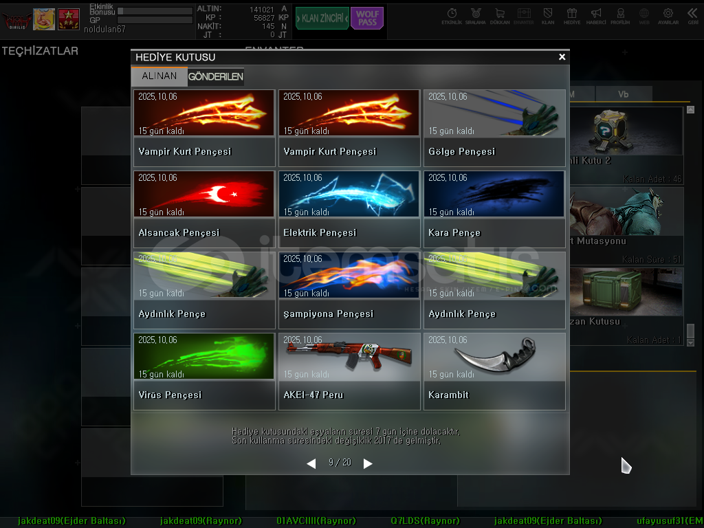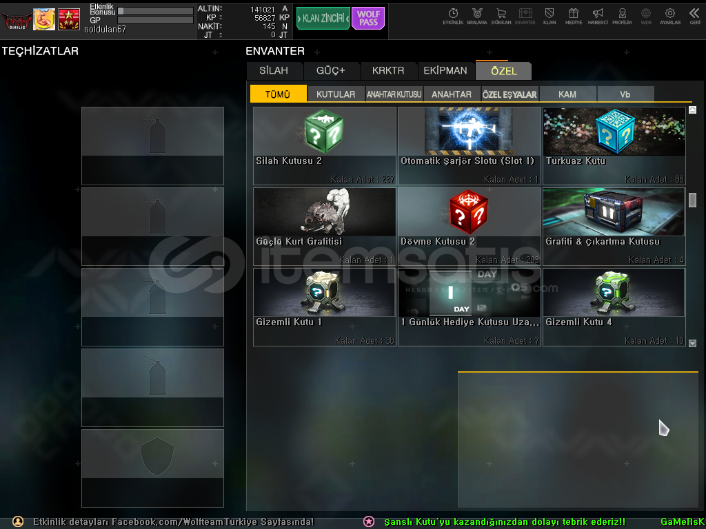 4 silah slotları acık magnum G sınırsız gün duvar kosusu kurt koruması sınırsız gün kukri yılbası bıcagı sınırsız gün envanterde kutus ılah vb var hedıye sayfası 20 sayfa var  UYGUN FİYATLI EFSANE HESAPLAR VE KLANLAR İÇİN bıze ulaşın