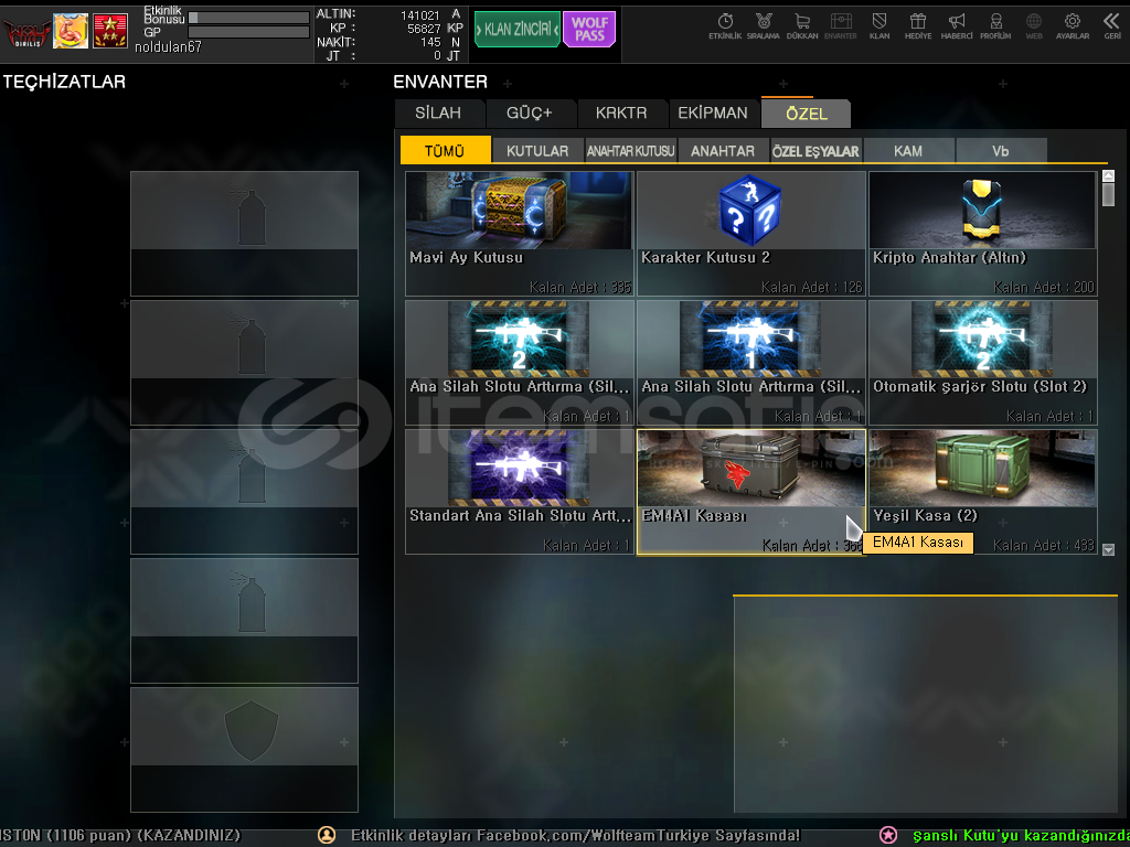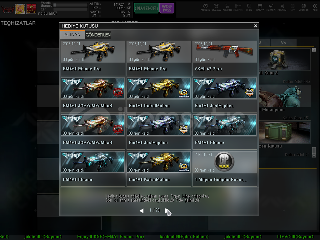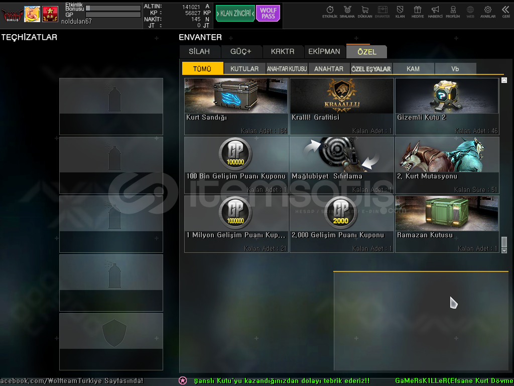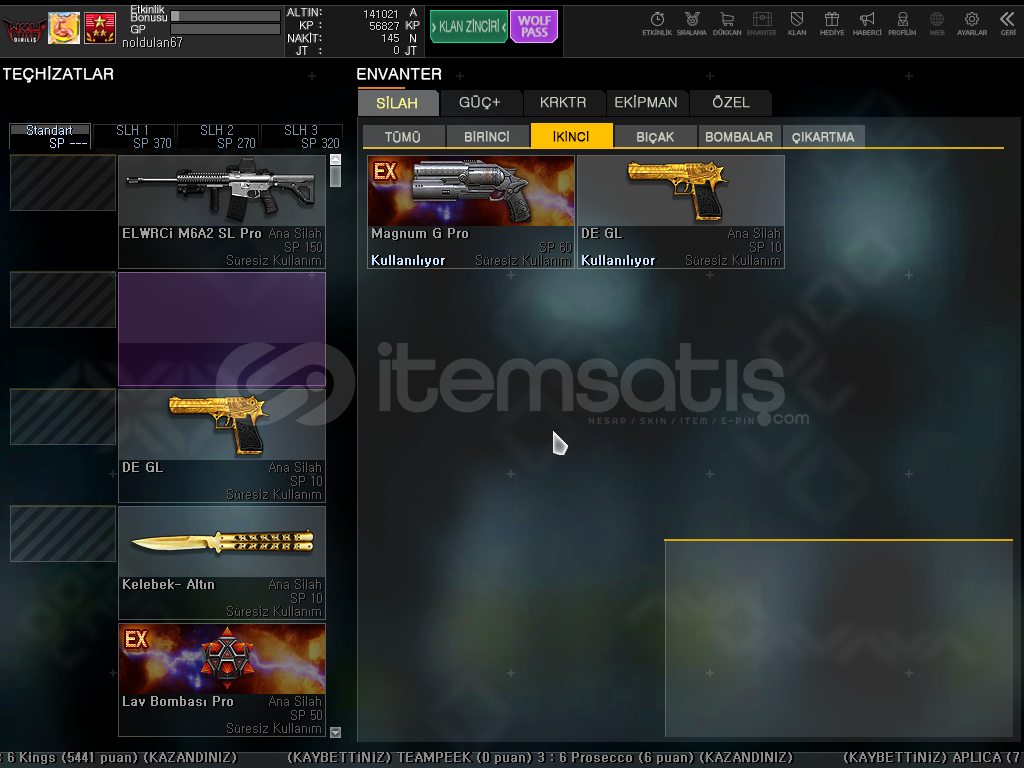 4 silah slotları acık magnum G sınırsız gün duvar kosusu kurt koruması sınırsız gün kukri yılbası bıcagı sınırsız gün envanterde kutus ılah vb var hedıye sayfası 20 sayfa var  UYGUN FİYATLI EFSANE HESAPLAR VE KLANLAR İÇİN bıze ulaşın
