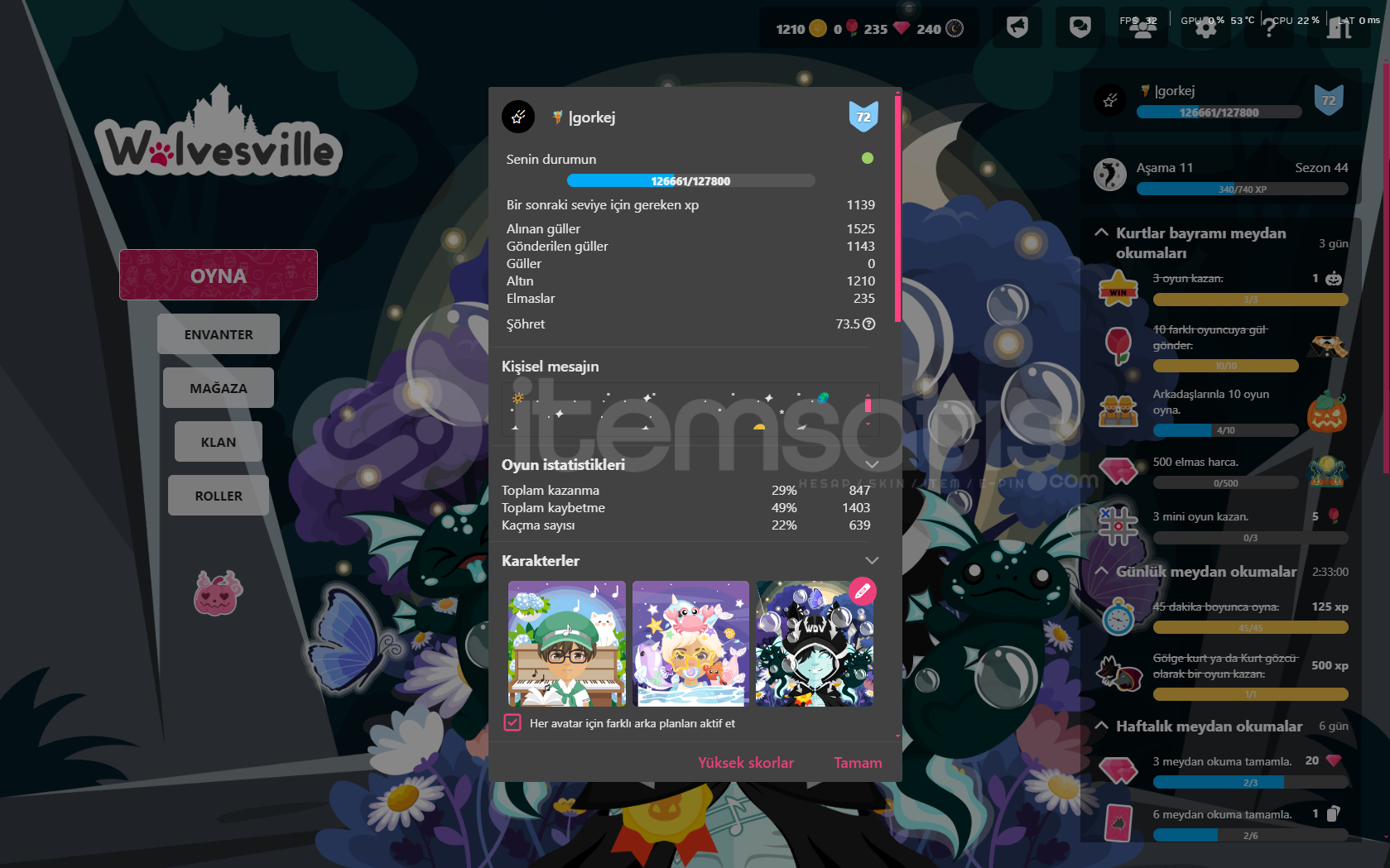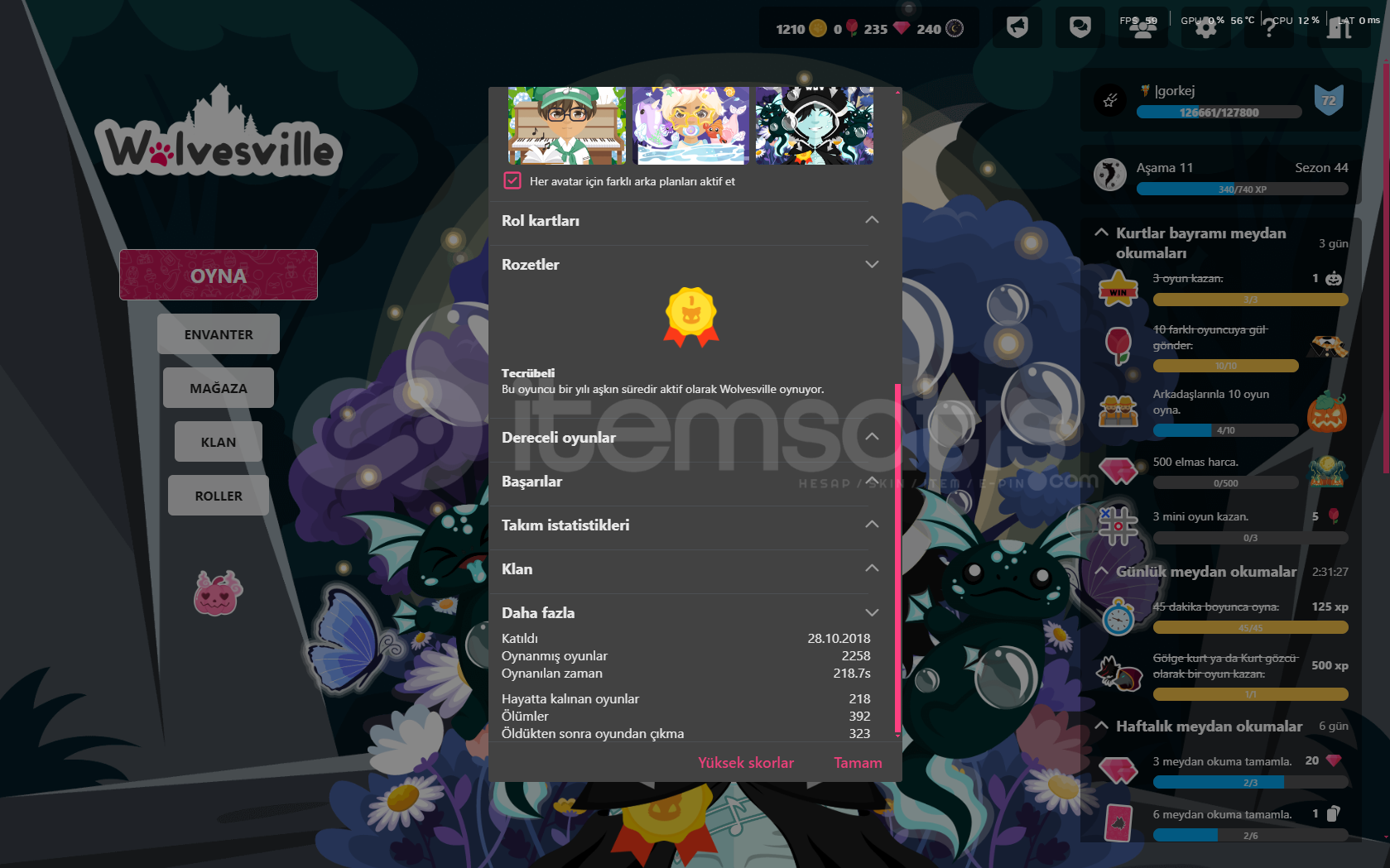Hesap 2018de kurulmuştur kendi ana hesabım. 1 yıldır aktif oyuncu rozeti var. 2020'den kalma passteki eşyalar vardır değerlidir. 82lvl hesap değerli. Eposta değişimi vardır.
