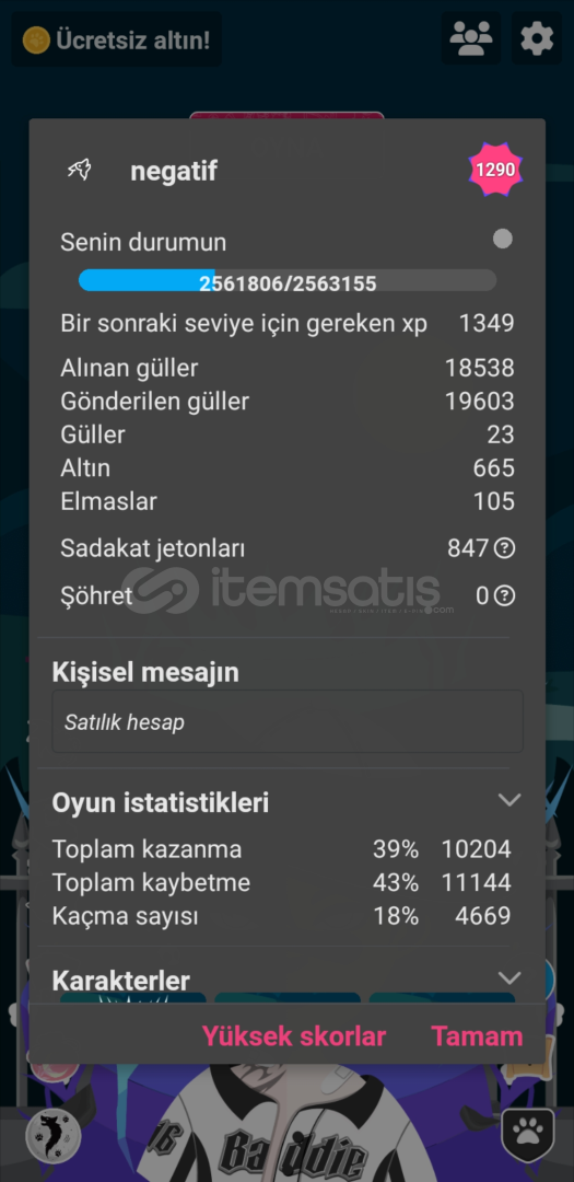 187 paralı skin, 199 battle pass skin, 21 rol skin, 2 ikon skin, 847 Sadakat jetonu, 24 karakter slotu, 2 emoji paketi + 160 bp ve takvim emojiler, 8 takvim, bazı rollerde %30 ve %50 yükseltme mevcut. Hesap seviyesi 1290187 Money skins, 199 battle pass skins, 21 role skins, 2 icon skins, 847 Loyalty tokens, 24 character slots, 2 emoji packs + 160 bp and calendar emojis, 8 calendars, 30% and 50% upgrades in some roles. account Level 1290