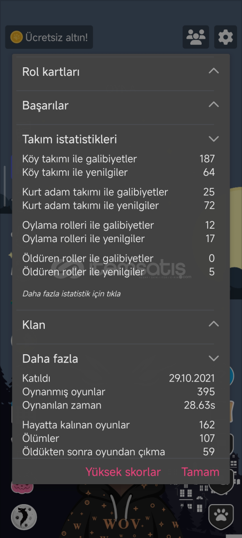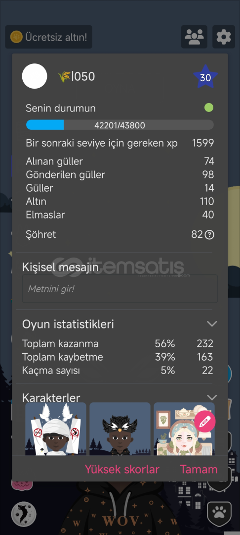 Wolvesville Özel İtemli Wolvesville Hesabı çok uygun fiyata satılıktır. Görsellerde bulunan şapka ve kıyafet eskiden karanlık tema ile alınabilen ama karanlık tema herkese ücretsiz geldiği için kaldırılan yani şu an alınamayan kombinlemelik güzel bir görünüşe sahip itemlerdir. Hesapta rol ikonu veya emote bulunmamaktadır.