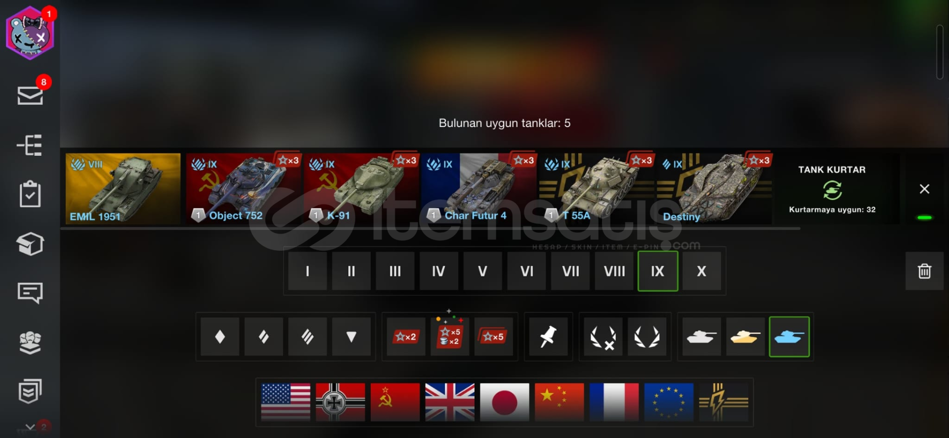 19 Adet X Seviye Ağaç Tank mevcuttur.10 Adet X Seviye Mavi Tank (Hatıra) mevcuttur.5 Adet XI Seviye Mavi Tank (Hatıra) mevcuttur.14 Adet VIII Seviye Mavi Tank (Hatıra) mevcuttur.10 Adet VII Seviye Mavi Tank (Hatıra) mevcuttur.TOPLAM 47 ADET MAVİ TANK VARDIR.Toplam 28 Adet Premium Tank vardır.Hesap gayet sağlamdır. Çok fazla paralı güzel tank vardır resimlerde görüldüğü gibi.Paraya ihtiyacım va...