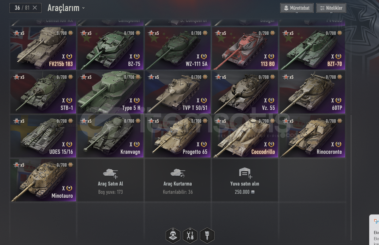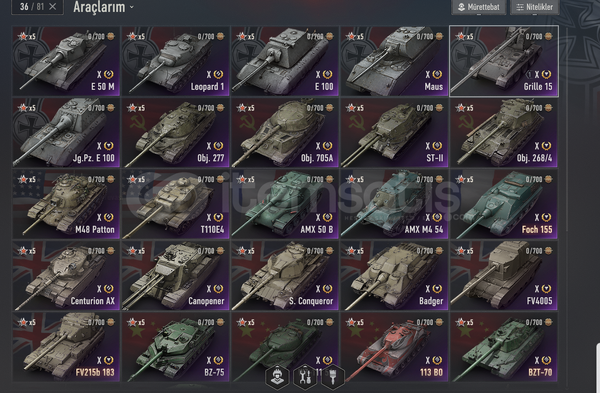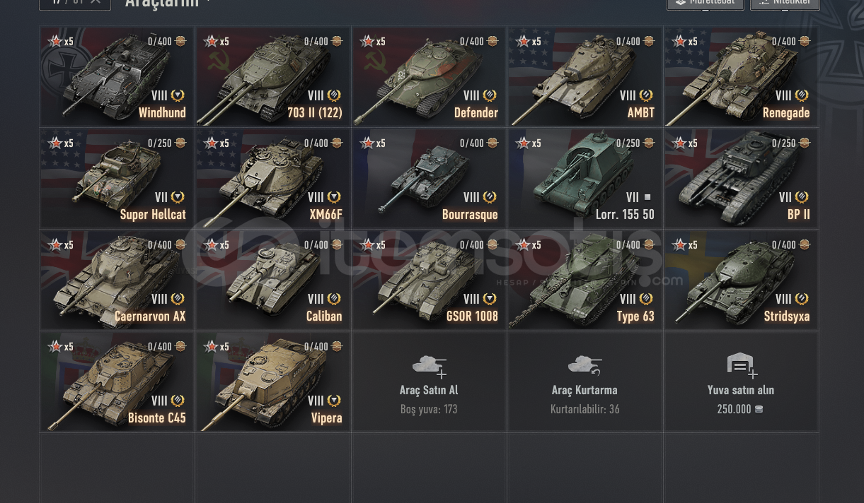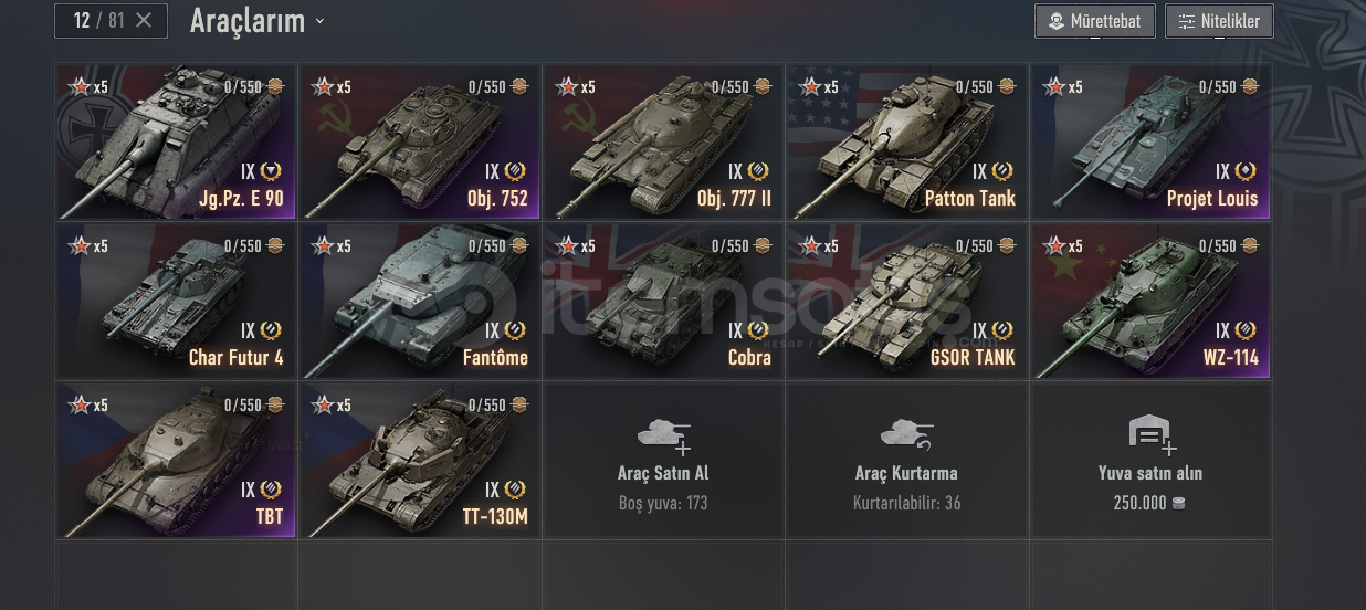 63 BİN ALTIN 10 BİN TAHVİL 220 GÜN PREMİNYUM 40 ADET X TİER 30 TANESİNDE 3B STİL MEVCUT 3 ADET XI 5 ADET PRE X SEVİYE TANK 15 ADET lX seviye pre tank 16 adet vııı SEVİYE PRE TANK HESAB GMAİLE VERİLECEK SONRA KENDİ ADINIZA ALIRSINIZ