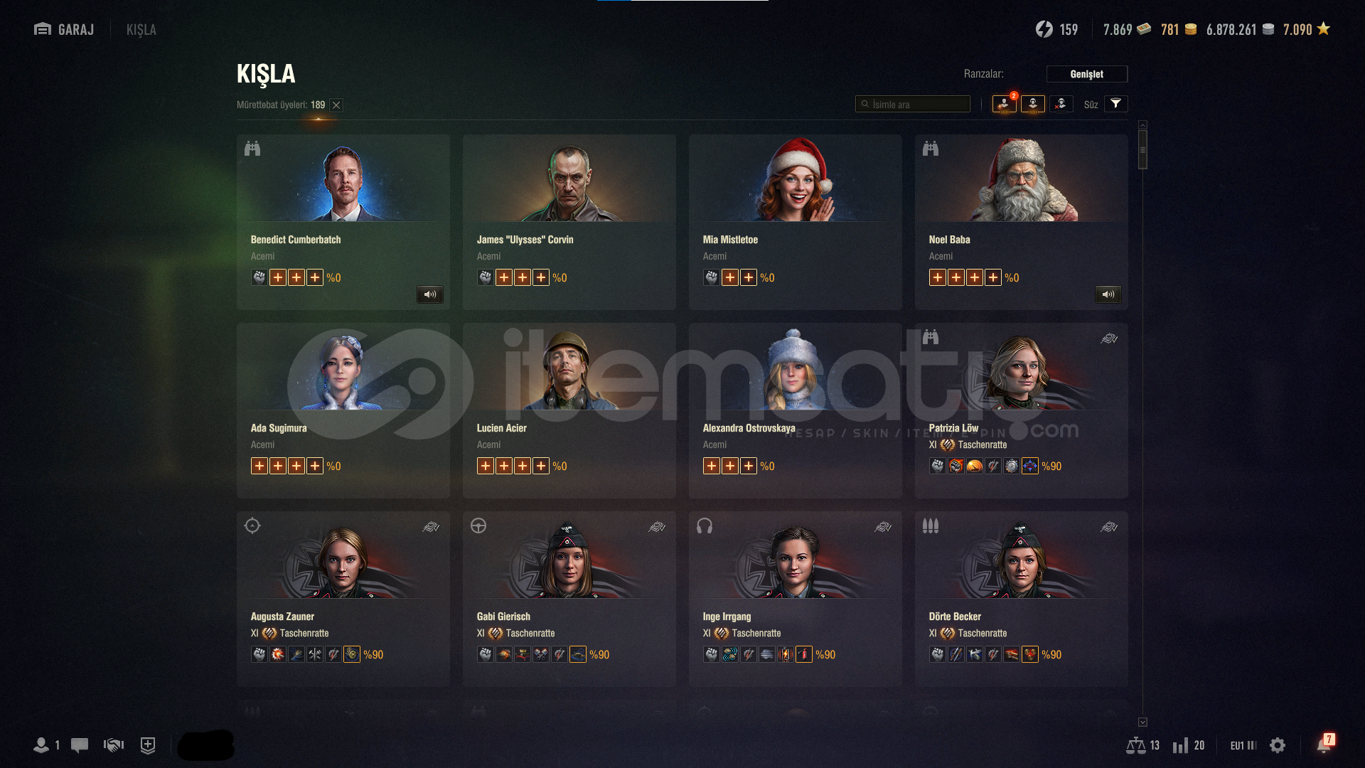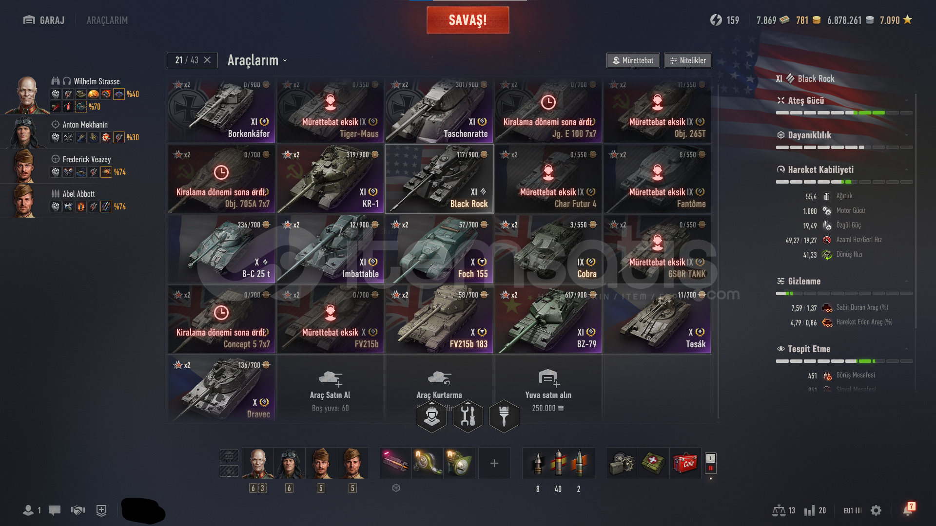 Black Rock Dravec ve Tier 11 tankların olduğu bol premium tanklı hesap Gelişmiş mürettebatlar ve alınmamış mürettebat üyeleri vardır