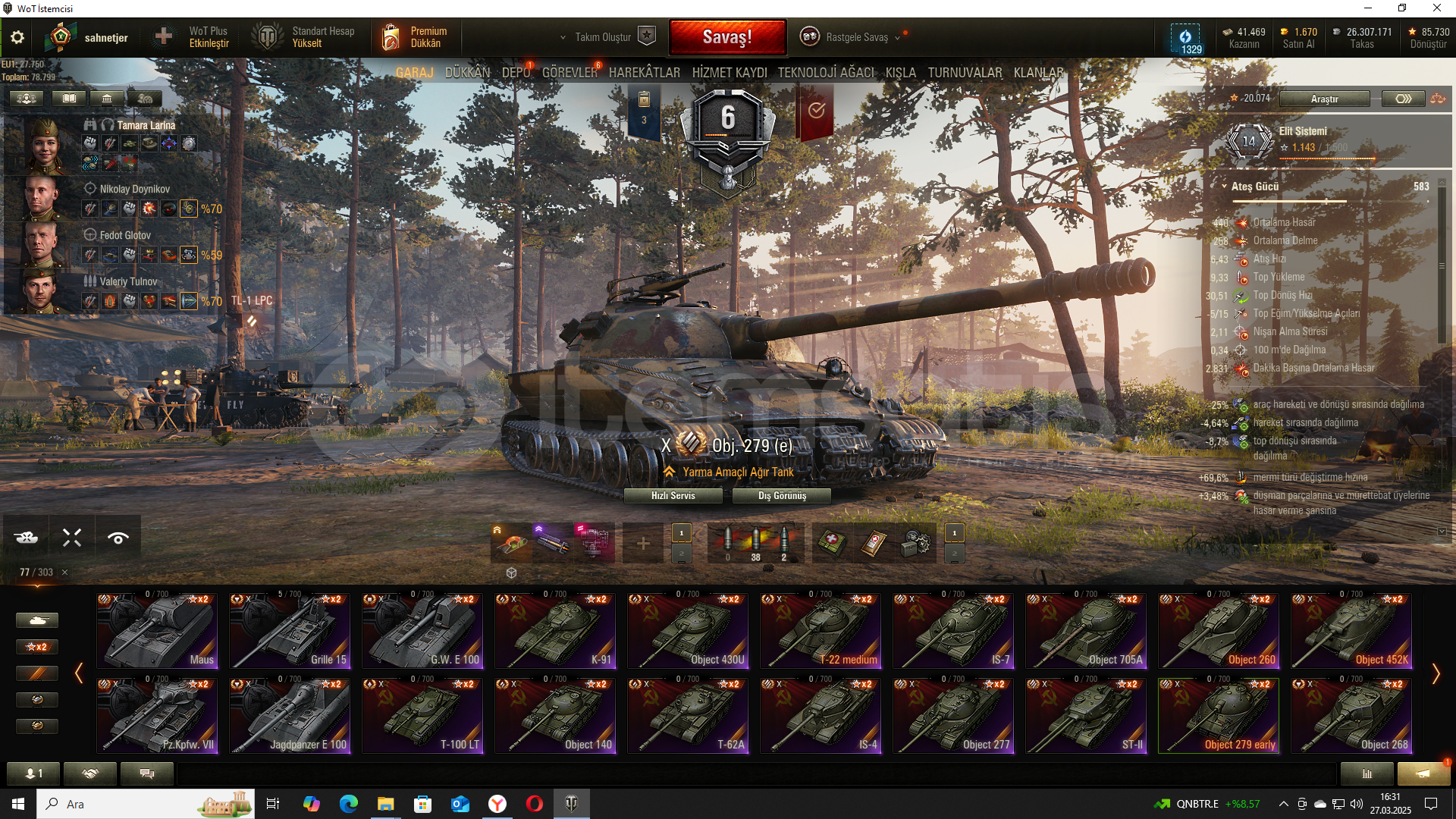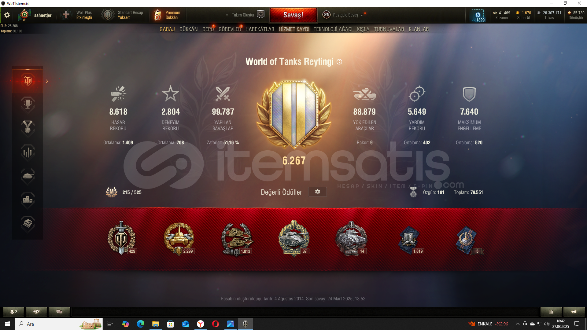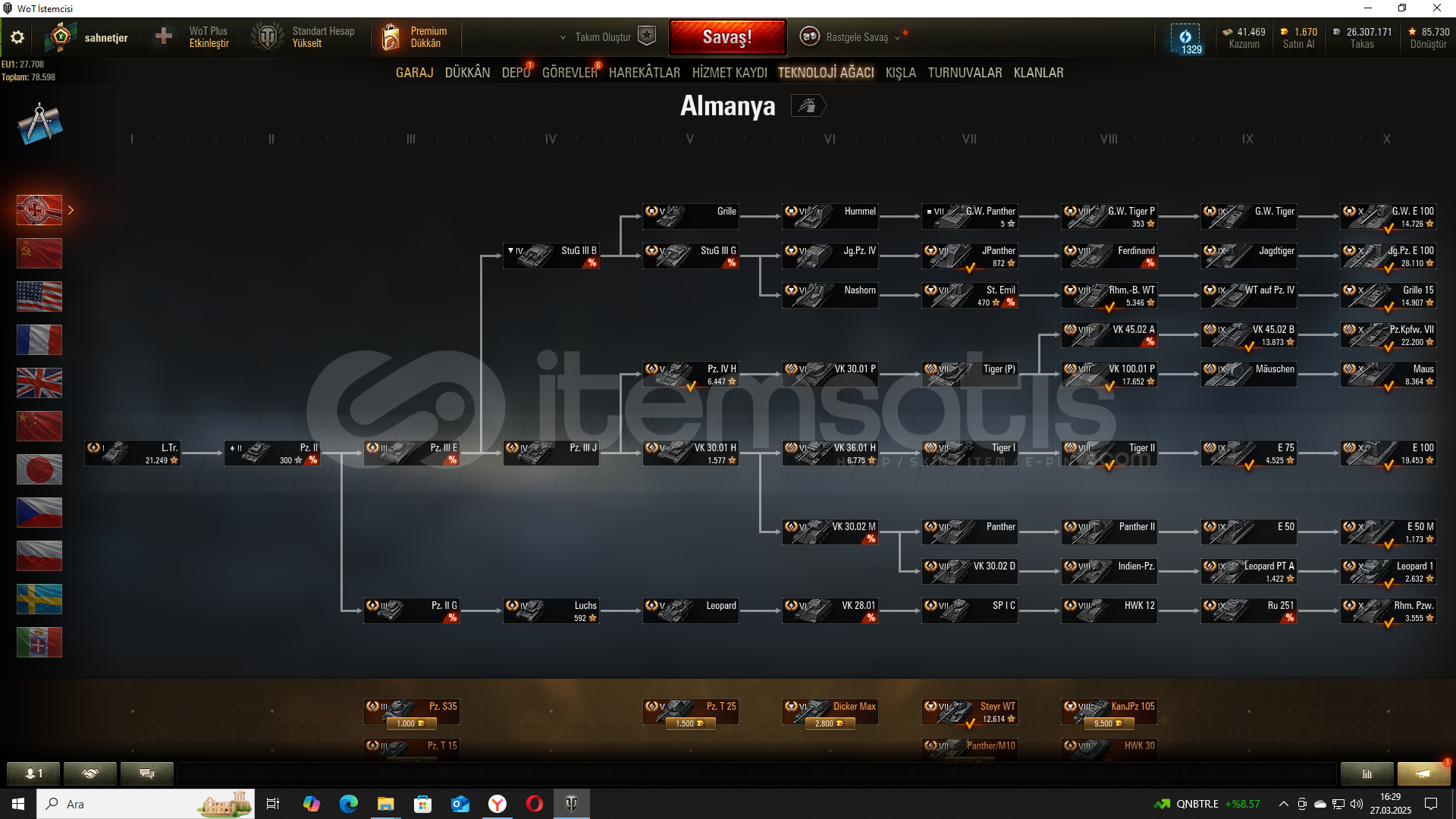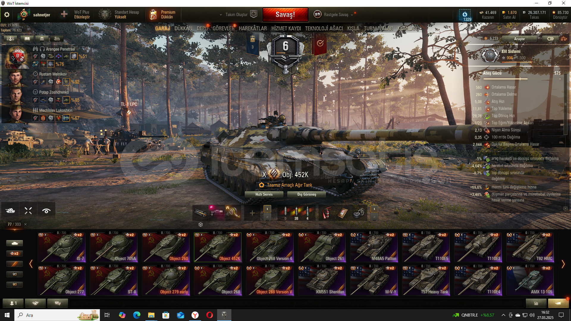 hesap resimlerde de görüldüğü gibi full.tüm 10 seviye tanklar açık.46 adet premium 8 seviye tank varnadir 10 seviye tanklar286 adet tank 7-8-9 seviyeler çoğunluktatüm tanklarda mürettebatlar çok iyi seviyedeextra kışlada alınmamış mürettebatlar da var100000 savaş yapılmışsürekli premium ile oynanmış bir hesap. depo da extra malzeme ve azık bulunmakta.2014 m...