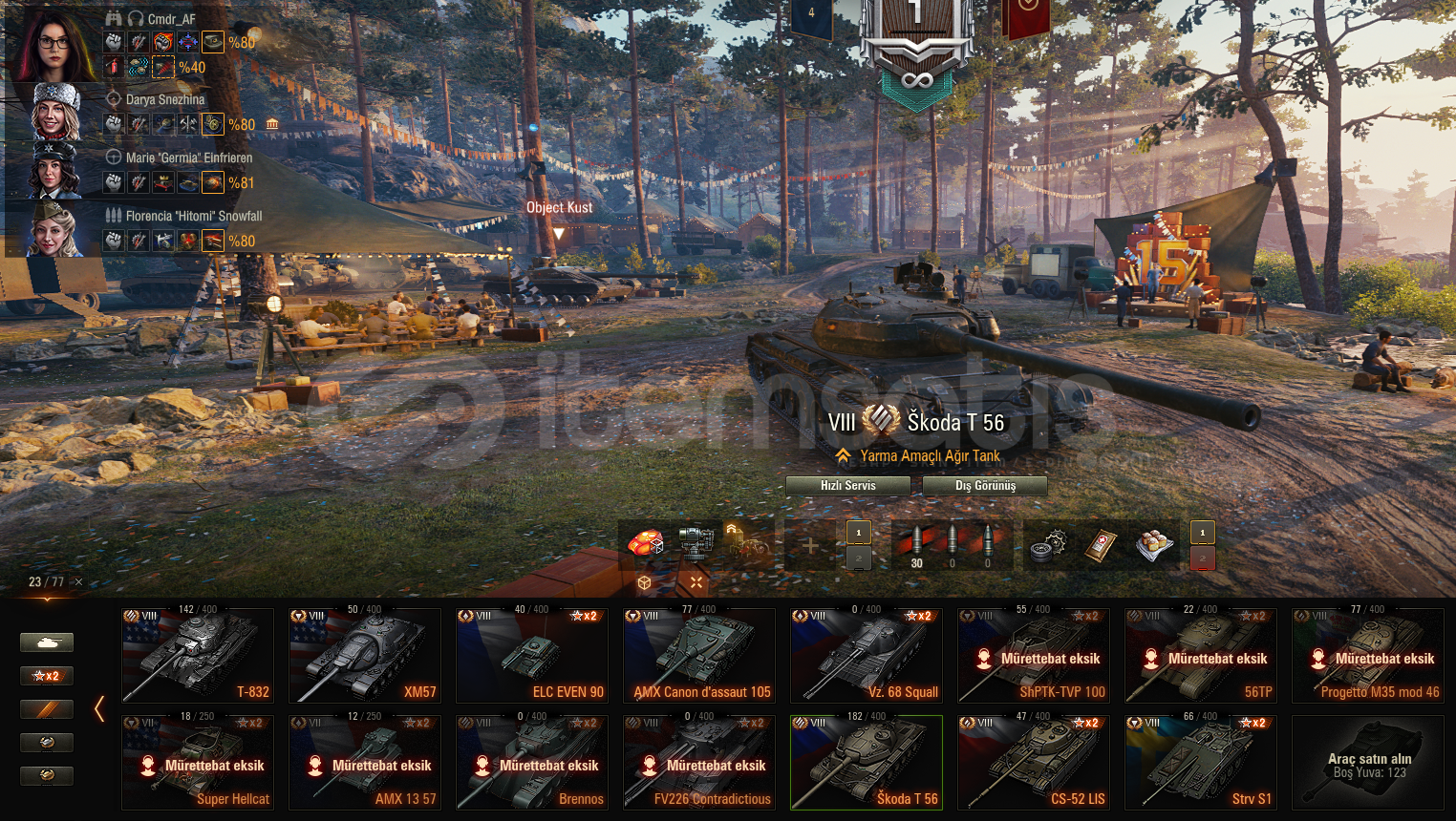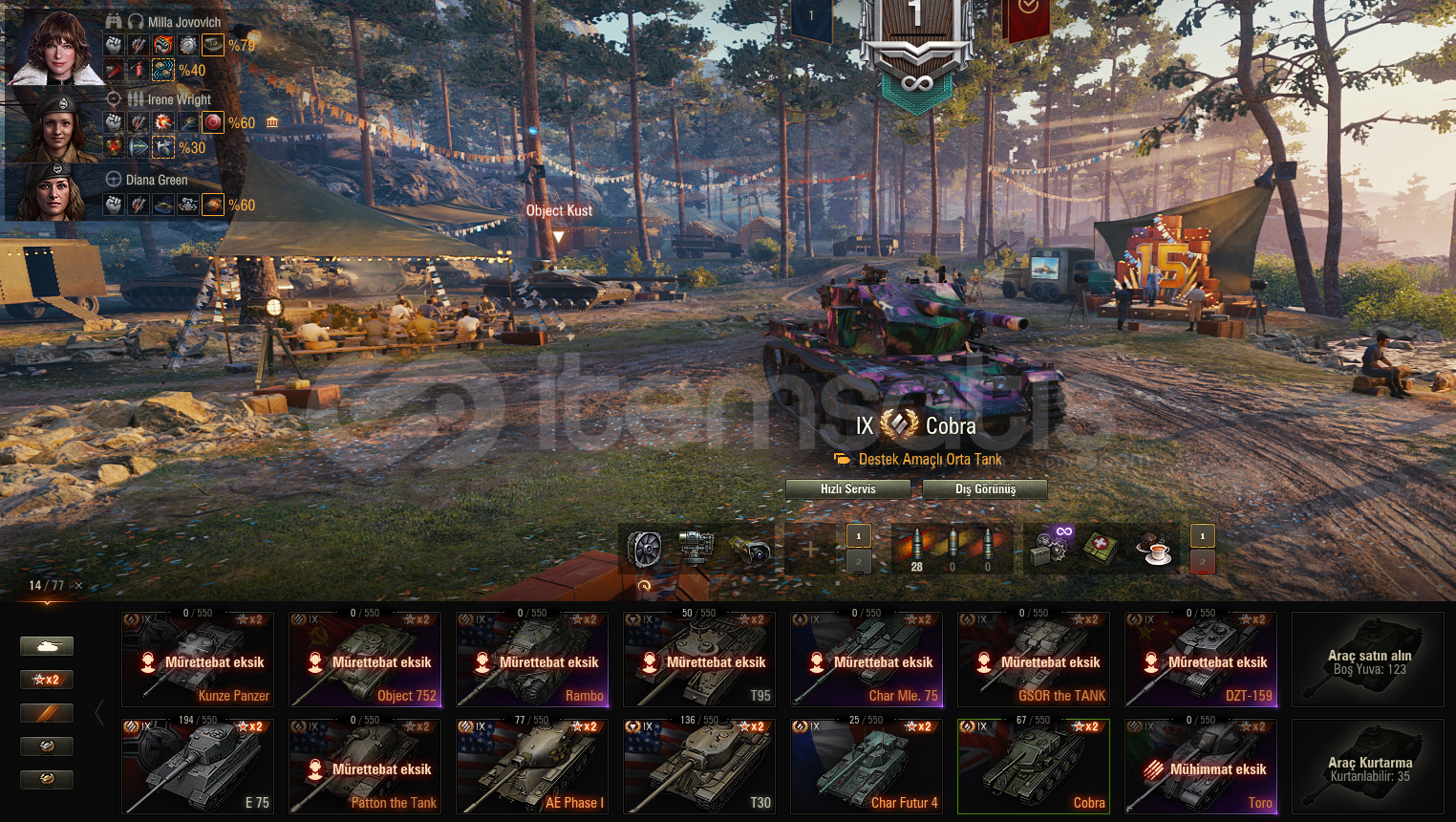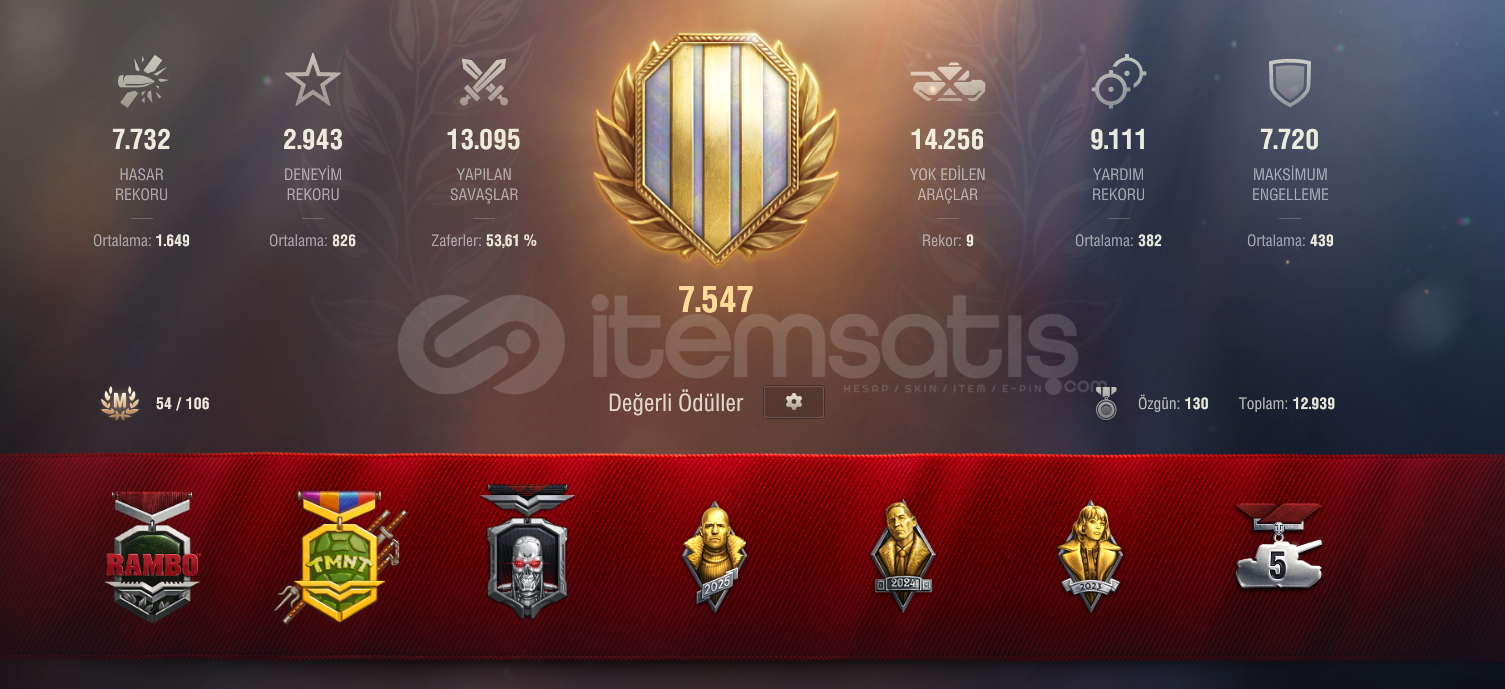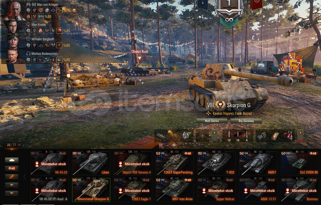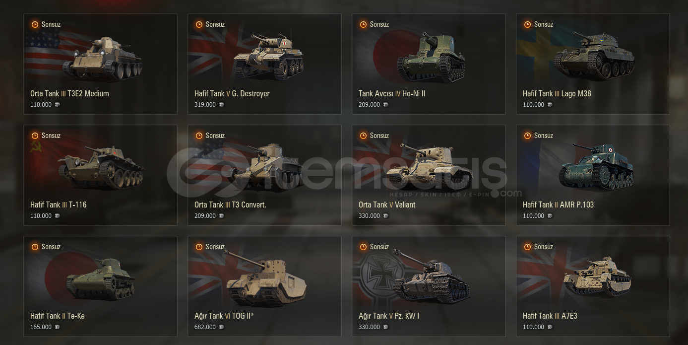 Reytingi 7500 üstü ve WN8i (2K)düzgün hesap. 5bin altın 100bin tahvil 1900 yedek vardır. Tanklar resimlerde mevcut ayrıca teknik ağaçta JGPZE100 - Grille15 - E100 - AMX50B - WZ1115A - STB1 ve RINOCERONTE açık şekilde bulunmaktadır.