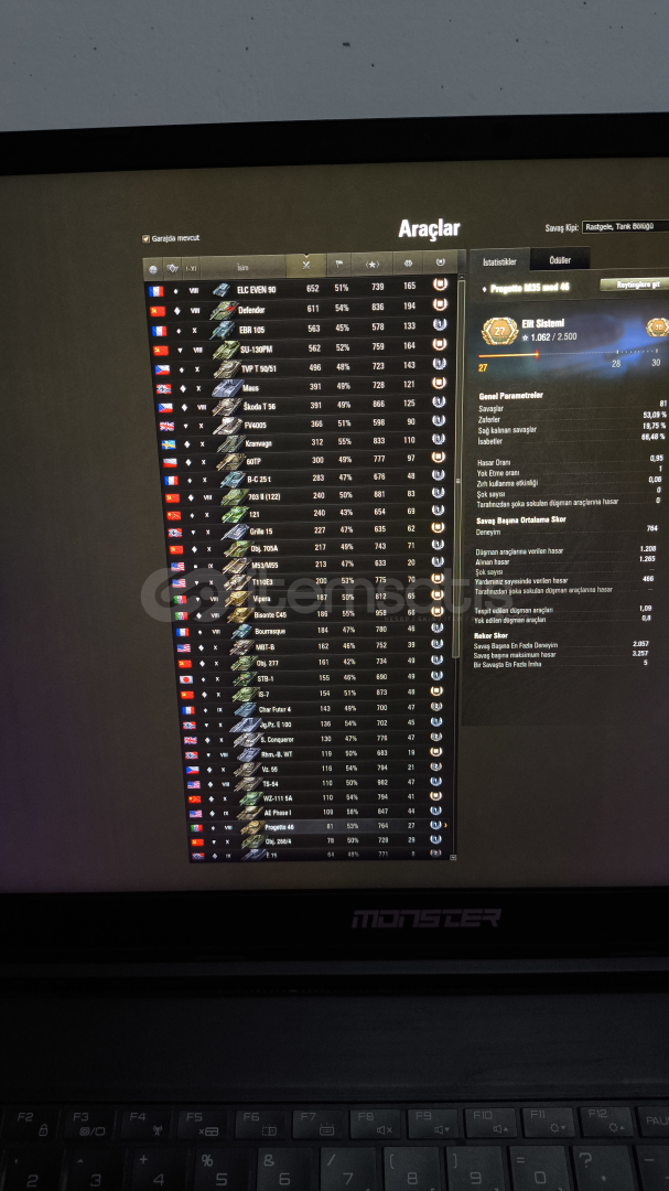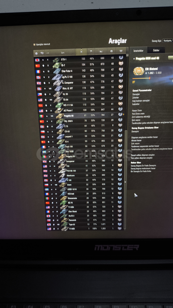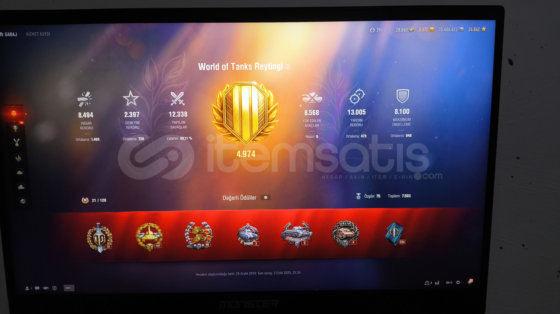 Yıllarca oynadığım ilk ve tek hesap.Raytingim düşük çünkü ilk seneler oyunu ögrenicem diye raytingi çöp etmişim.Aktif olarak 338 gün premium günü var62 adet güncel tankıevcutkurtarılabilir tank 20 e yakındır ve çoğu 8 9 premiumdur28 bin tahvil15 milyon gümüş3577 altın mevcutturMbt b tankı mevcuttur ki sadece bunu almak 10 bin tl civarinda para har...