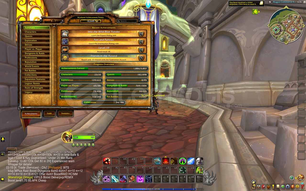 Hesapta Feldrake, Invincible gibi 229 mount bulunmaktadır.Hesapta iki main karakterim kazzak serverinde level 70 - 420 -3160rio, level 70 - 419shdow priest 2900rio, ve birçok level 70 mevcuttur. En son 2 yıl önce 6/8 mythic şeklinde bırakmıştımMage ve priest için Tower of mages tamamlanmıştır.Güncel sezon alınmamıştır.