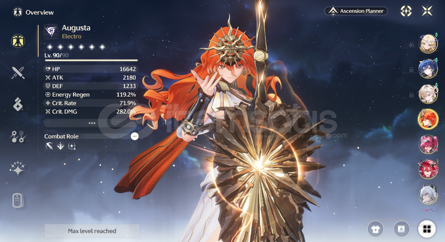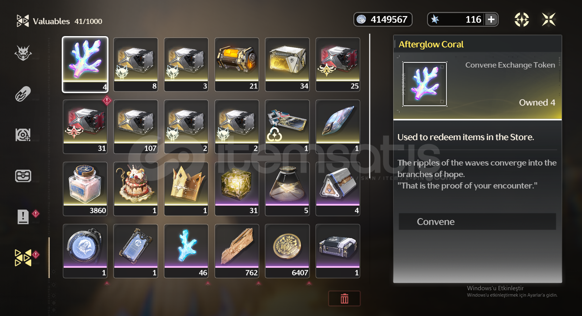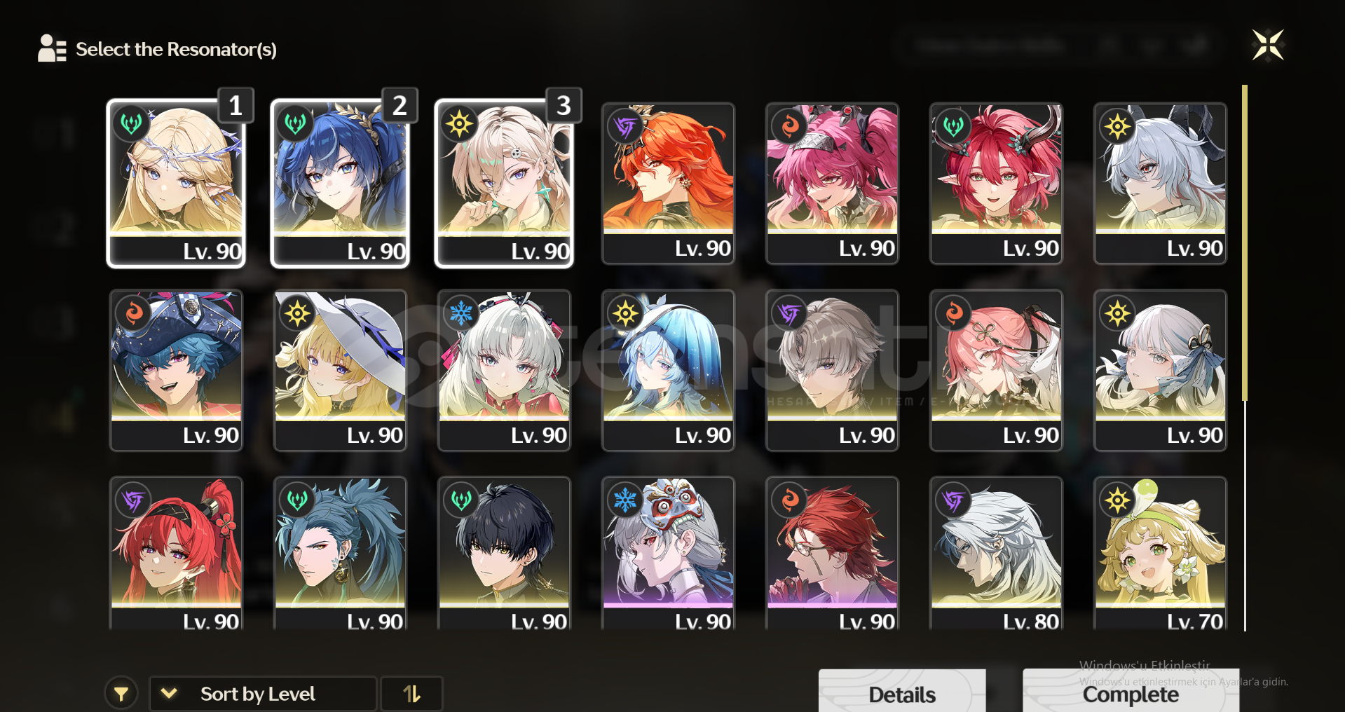 oyunu oynamadıgım ıcın satıyorum vaktım yok cogu karakter var yenı harıtaya dokunmadım bolca wısh kaynagınız var ...lynae sılahı syan 68 pıtylerde onuda 1saat dolasark alırsınız ben gıremedıgım ıcın alamadım. c3 verına c3 calcaro c3 encore..c1 jıanxın tum 4 yıldızlı karakterlerın hepsı 6 yıldız....karakterlerın hepsı b...