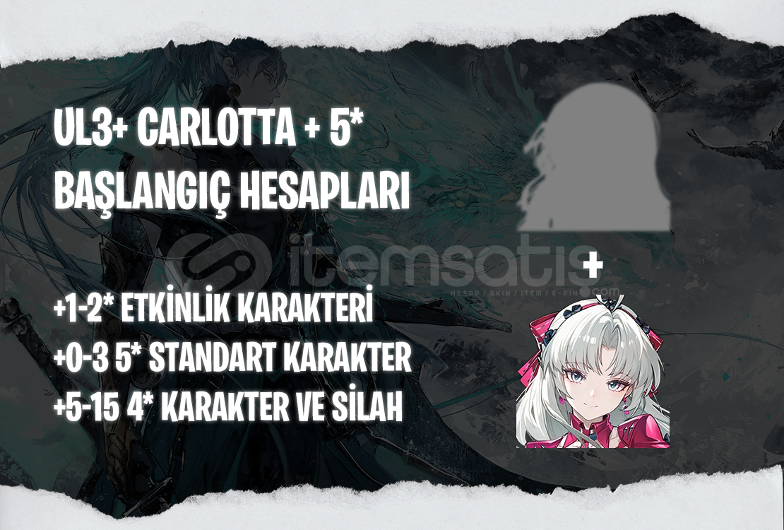 Bu ilanı satın aldığınızda UL3+ seviyesinde içerişinde Carlotta ve istediğiniz 5* etkinlik karakteri bulunan bir hesap tarafınıza iletilecektir.