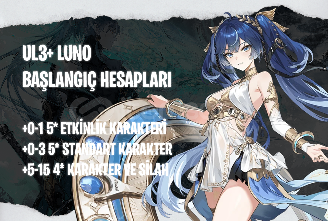 Bu ilanı satın aldığınızda UL3+ seviyesinde içerişinde Luno bulunan bir hesap tarafınıza iletilecektir.Hesapların içerişinde 0-3 adet 5* standart karakter içerebilir.Hesapların içerişinde bir miktar astrite bulunabilir.Tüm hesaplarımız garantilidir  ve alım sonras eposta bilgileriyle birlikte eksiksiz olarak te...