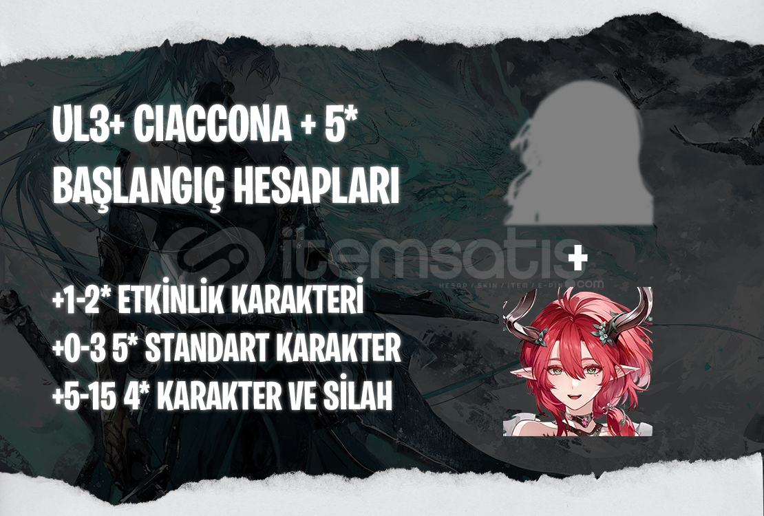 Bu ilanı satın aldığınızda UL3+ seviyesinde içerişinde Ciaccona ve istediğiniz 5* etkinlik karakteri bulunan bir hesap tarafınıza iletilecektir.