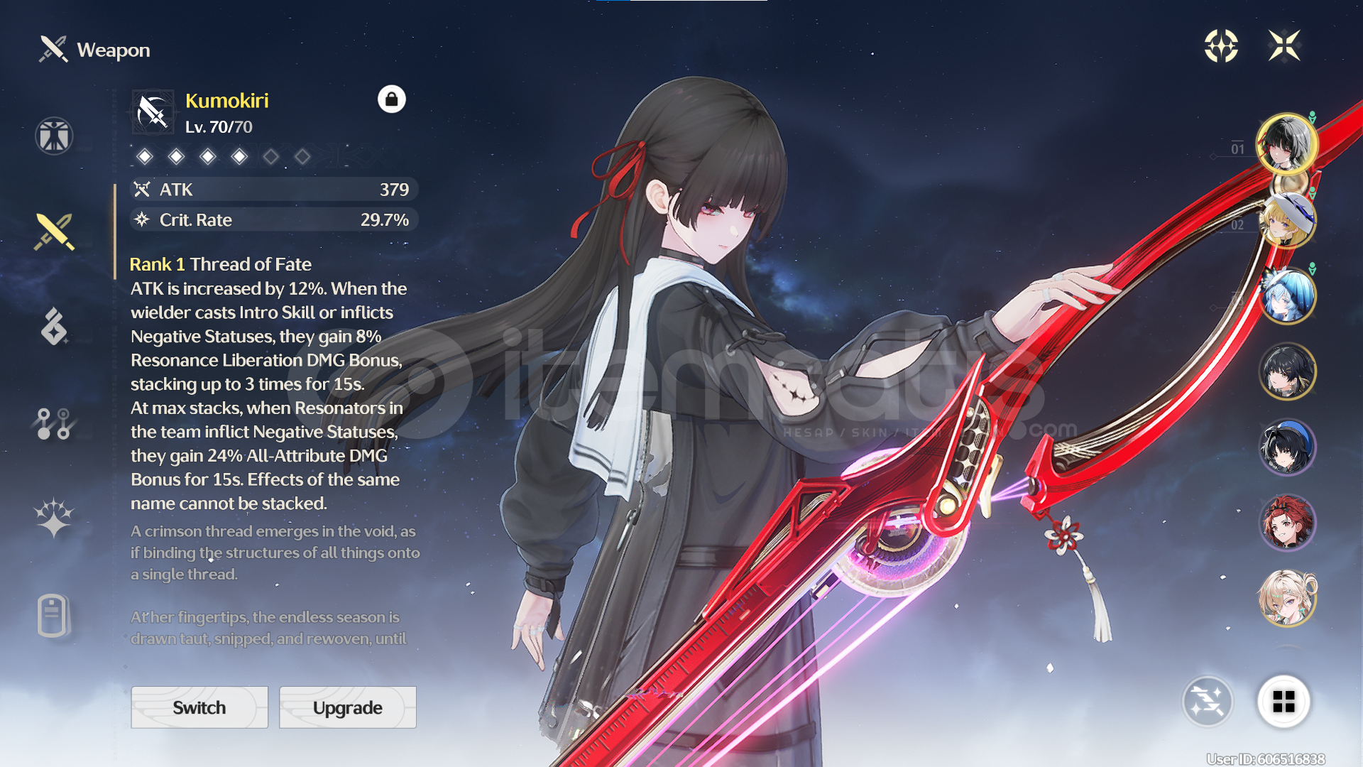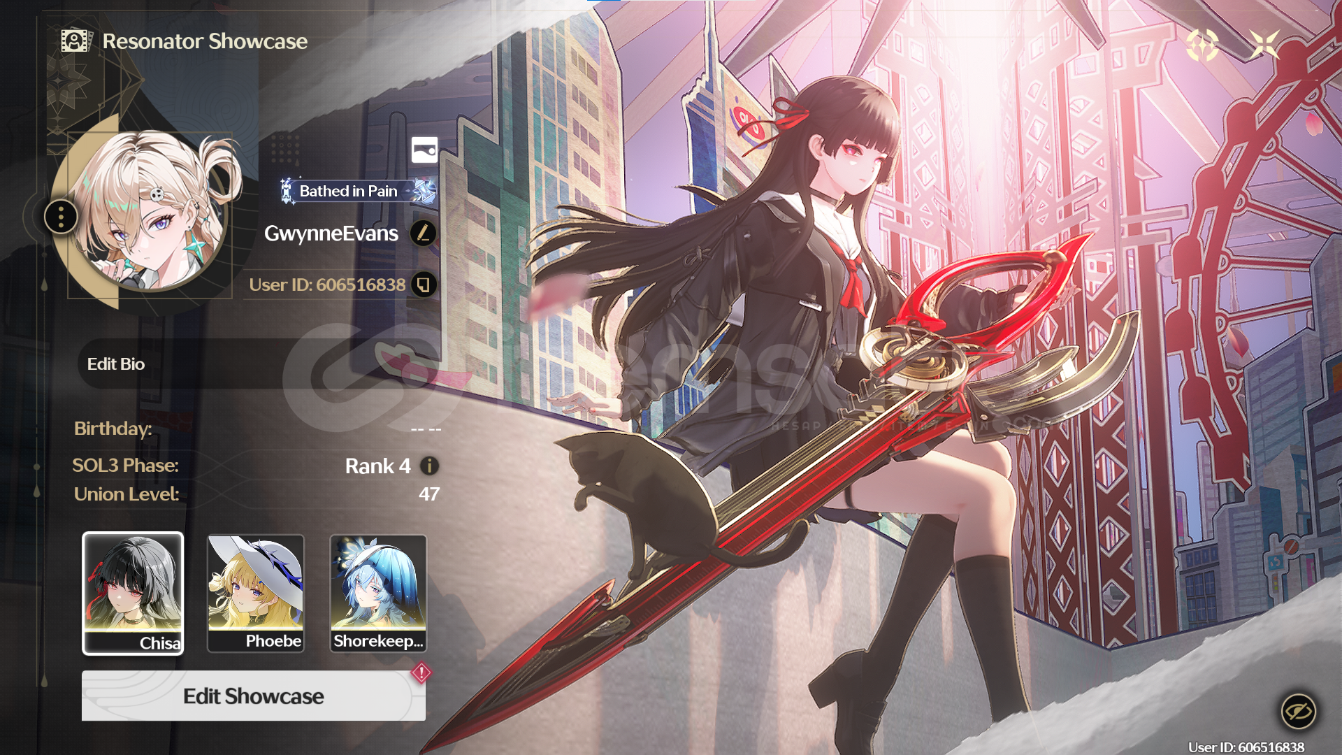 -- Hesapta bulunan karakterler / silahlar --S1 Chisa + Kumokiri / Phoebe / Shorekeeper / Lynae / Calcharo / Jianxin / S1 VerinaRate up yokturKarakterler seviyeleri yükseltilmiştir (40+) (Lynae 20 seviyedir ve buildsizdir) ve buildleri yarımdır!!