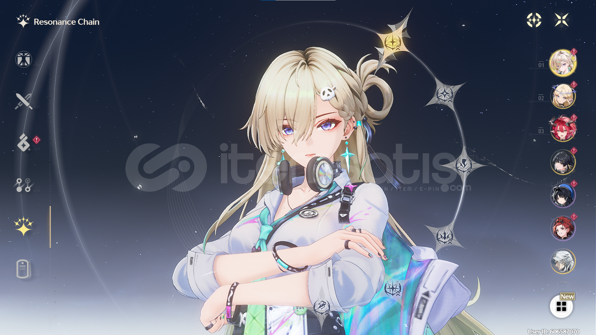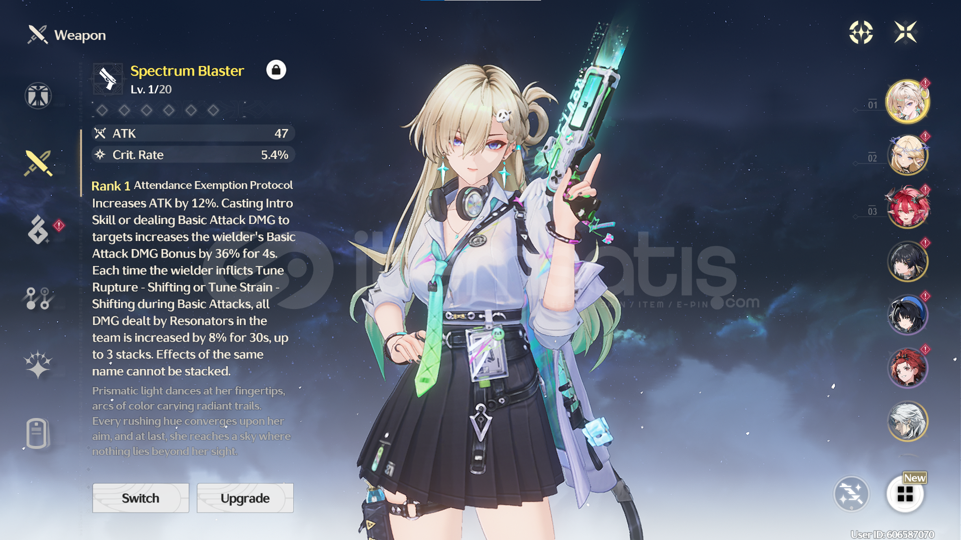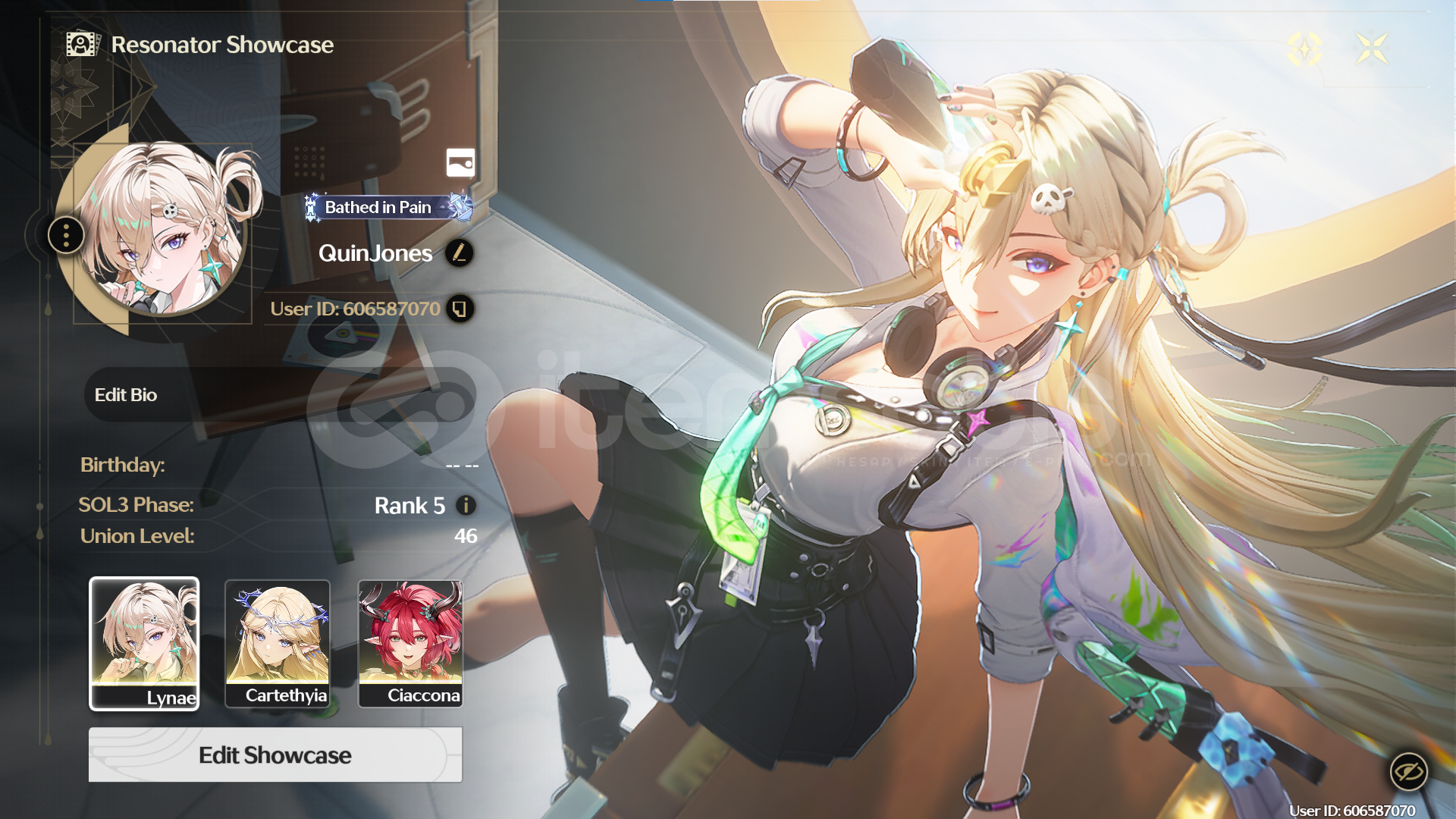 -- Hesapta bulunan karakterler / silahlar --S1 Lynae / S1 Calcharo / Encore / Cartethiya / Ciaccona / Verina / Linyang / Phasic Homogenizer / Spectrum Blaster (Lynae Silahı) Rate up vardırKarakterler Level 1 olarak verilmektedir ve buildleri yoktur!!