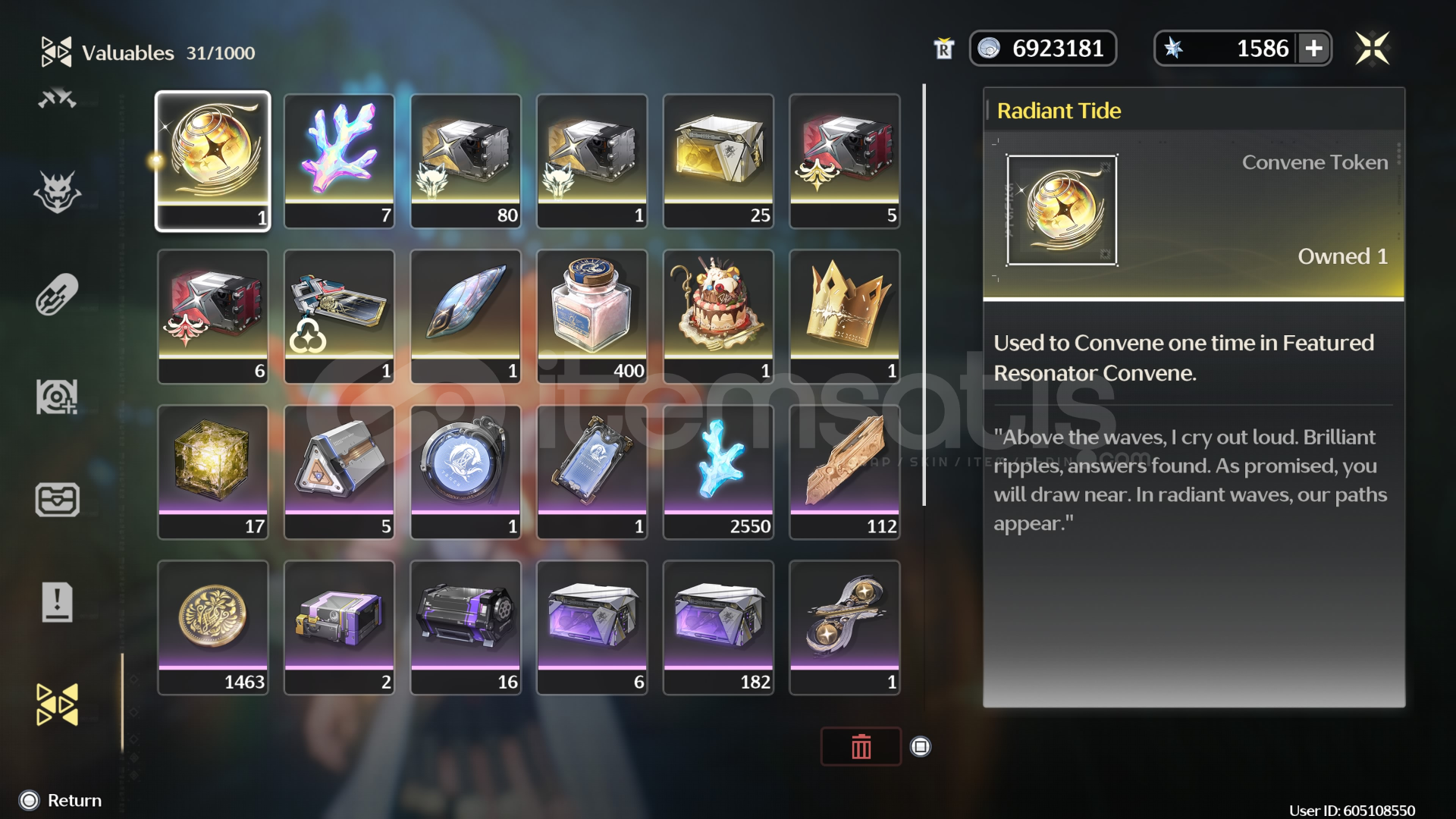 Güncel Wish Sayısı: 4Augusta + Thunderflare DominionLupa + Wildfire MarkPhrolova + Lethean ElegyChangli + Emerald of GenesisZani + Abyss SurgeShorekeeperCarlottaS2 VerinaEncoreLingyangRover + Bloodpact's Pledge Max RefineData Bank Max Level.Tüm Bölgeler 100Karakter Banner Pity 26Silah Banner Pity 6Standart Silah Pity 30Carlotta hariç tüm karakterler kasılıdır.Akşam 18:00 dan önce alırsanız daha hızlı teslim ederim....