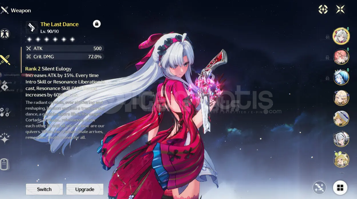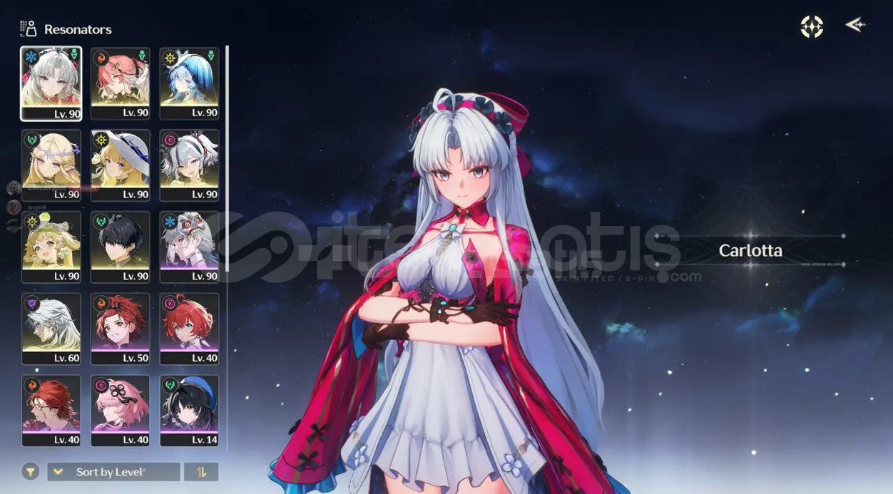 S3 Carlotta Rank 2 Silah Chisa Cartethyia Phoebe ve silahı Camellya ve silahı Shorekeeper Changli ve bütün standart karakterler ve bütün 4 yıldızlı karakterler var