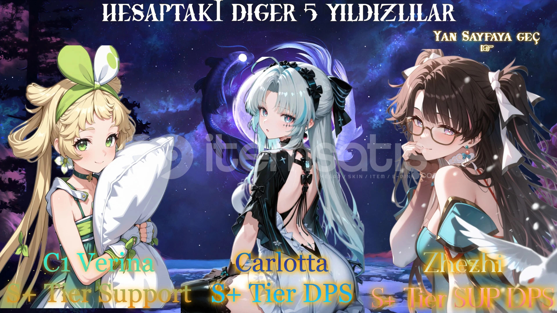 Hesabın orjinal UL Seviyesi 9 du ben günlük giriş ödülerini alarak 15UL çıkardım.RATE UP MEVCUT. SONRAKİ KARAKTERİNİZ GARANTİDİR (YENİ!)-------------------------------------------33 Standard Silah Pity.37 Limited PityHesaptaki 5 yıldızlar ve değerleri----------------------------------------------------Carlotta (EN İYİ SS+ TİER DPS )The Shorekeeper + imza silahı ( Her T&u...