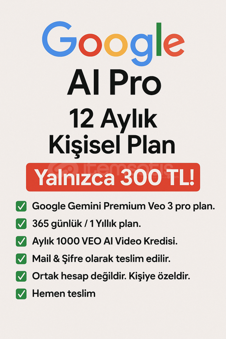 ☑️ Google Gemini Premium Veo 3 pro plan. ☑️ 365 günlük / 1 Yıllık plan. ☑️ Aylık 1000 VEO AI Video Kredisi. ☑️ Mail & Şifre olarak teslim edilir. ☑️ Ortak hesap değildir. Kişiye özeldir. ☑️ Hemen teslim.