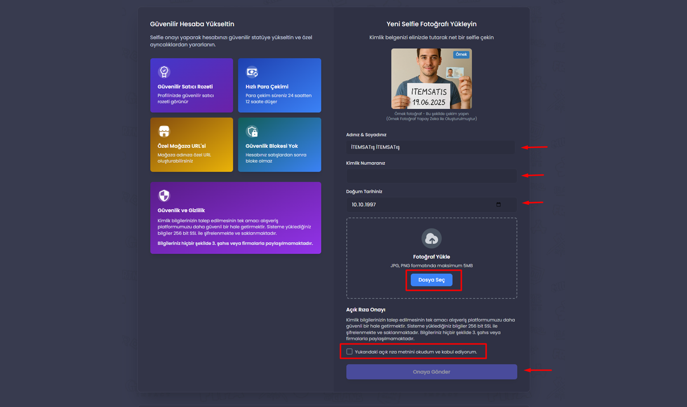 Kimlik bilgilerinizin talep edilmesinin tek amacı alışveriş platformumuzu daha güvenli bir hale getirmektir. Sisteme yüklediğiniz bilgiler 256 bit ssl ile şifrelenmekte ve saklanmaktadır. Bilgileriniz hiçbir şekilde 3. şahıs veya firmalarla paylaşılmamaktadır. İtemSatış.com Bu bilgileri sadece olası bir adli süreç durumunda T.C. Adalet Bakanlığına bağlı kurumlarla paylaşabilecektir. Bunun haricinde bir veri paylaşımı, ticari amaç güdülmemektedir.