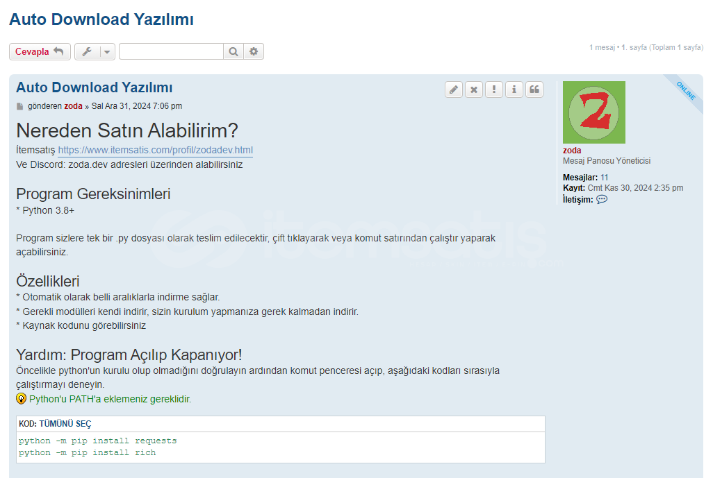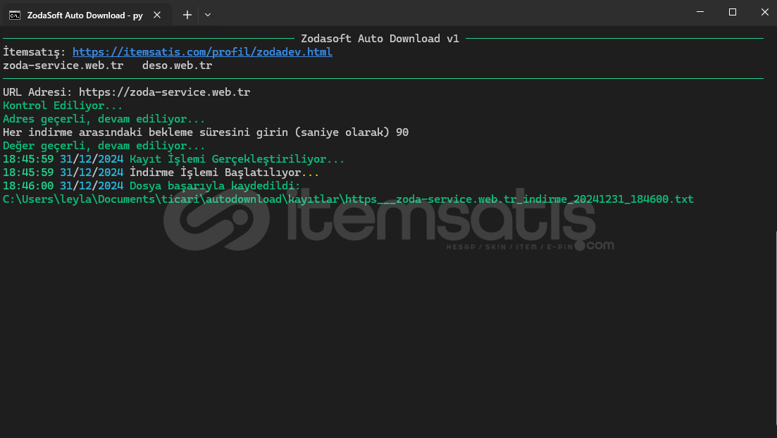 Otomatik olarak website mi yedekleyeceksiniz? veya otomatik indirme almanız mı gerek, bu yazılım size göreProgram Gereksinimleri* Python 3.8+Program sizlere tek bir .py dosyası olarak teslim edilecektir, çift tıklayarak veya komut satırından çalıştır yaparak açabilirsiniz,İade yoktur.ÖzellikleriOtomatik olarak belli aralıklarla indirme sağlar..exe .png .jpeg .html .txt .mp4 ve daha bir çok...