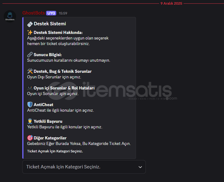 **GhostBot - Premium Obfuscated Discord Bot Satılık!** 🚀**Özellikler:**- **Full Obfuscated Kod:** String Array, Control Flow, Self-Defending, Rename, Shuffle – Kimse okuyamaz! 💪- **20+ Komut:** Ban, Kick, Mute, Unmute, Avatar, Leaderboard, Ticket, Rank, Stats, Level Role, Log Clear, Server Info, Timeout, Unban, Unlock, Untimeout, Yazi-Tura, Ask, Avatar, Kick, Lock, Nuke, Rank, Stats, Ticket, Timeout, Unban, Unkick, Unlock, Untimeout, Yazi-Tura.- **Database En...