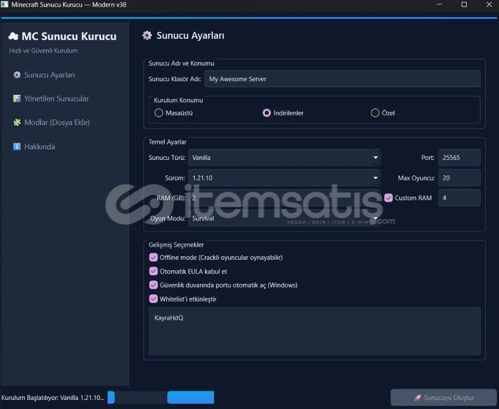 🌟 Sunucu Oluşturucu💡 Ne İşe Yarar?Otomatik Sunucu Oluşturucu sayesinde hiçbir teknik bilgiye ihtiyaç duymadan kendi sunucunuzu kolayca kurabilirsiniz!Sunucu dosyalarını sizin yerinize otomatik olarak kurar.Tek bir tuşla sunucunuzu başlatabilirsiniz.Kurulum tamamen kendi bilgisayarınıza yapılır; bu sayede ücretsiz ve sınırsız bir sunucuya sahip olursunuz.Normal sunuculardan h...