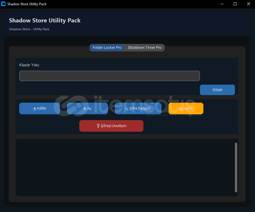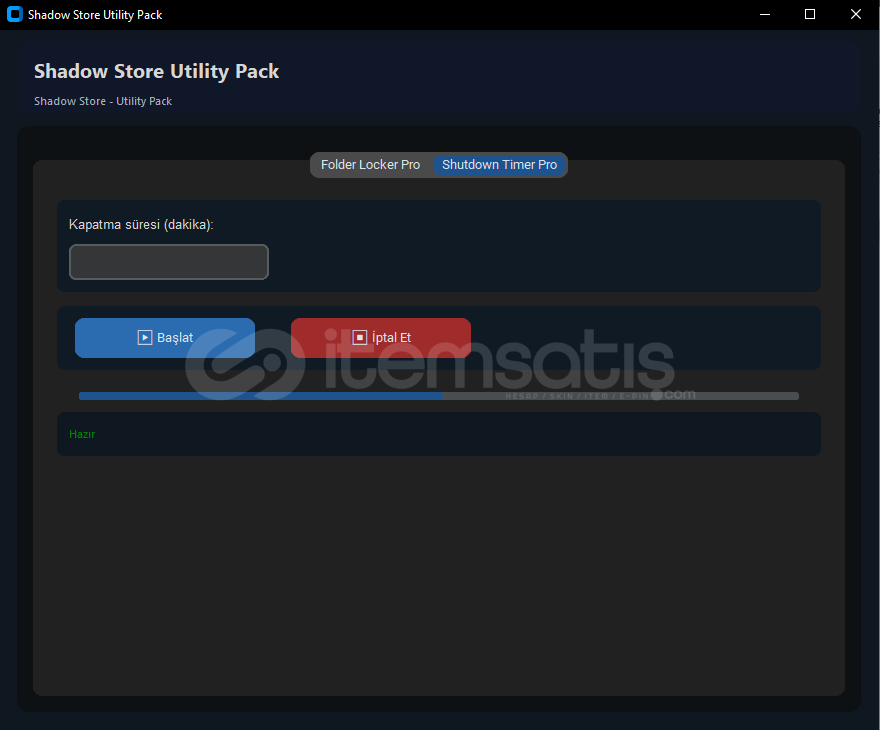 🌟 Shadow Store – Utility Pack 1🌟🔥 Klasör Kilitleme & Gizleme Modülü / Folder Locker ProDosyalarınızı güvenle koruyun.Şifreleme ve gizleme özellikleriyle kimse klasörlerinize erişemez.Basit, kullanıcı dostu arayüz ile anında işlem.⏱ Shutdown Timer Pro ModülüBilgisayarınızı istediğiniz sürede otomatik olarak kapatın.Zamanlayıc...