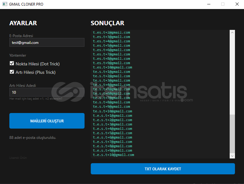 Merhaba, 'Gmail Cloner Pro' yazılımı ile tek bir Gmail hesabınızdan saniyeler içinde binlerce geçerli e-posta adresi üretebilirsiniz!